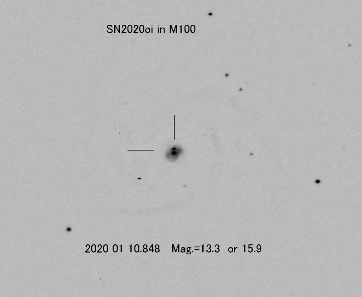 7 января в спиральной галактике М100 в созвездии Волосы Вероники была обнаружена очередная, уже седьмая по счету, сверхновая звезда. (SN 2019ehk, 2006X, 1979C, 1959E, 1914A, 1901B) Предыдущая вспыхивала в прошлом году! На момент открытия блеск сверхновой, получившей обозначение 2020oi (= ZTF20aaelulu), составил 17,3m. Тип сверхновой установлен Ic. При расстоянии до галактики 53,5 млн.св.лет блеск сверхновой может превысить 14m, что сделает ее доступной для наблюдений с 200-мм апертурой. Координаты. R.A. = 12h22m54s.925, Decl. = +15°49'25".05 http://www.ztf.caltech.edu/По последним данным блеск сверхновой в галактике М100 достиг 14,8m. Видимость под утро. Правда, пока наблюдениям будет мешать Луна. http://www.rochesterastronomy.org/supernova.html#2020oi Просмотров: 2192