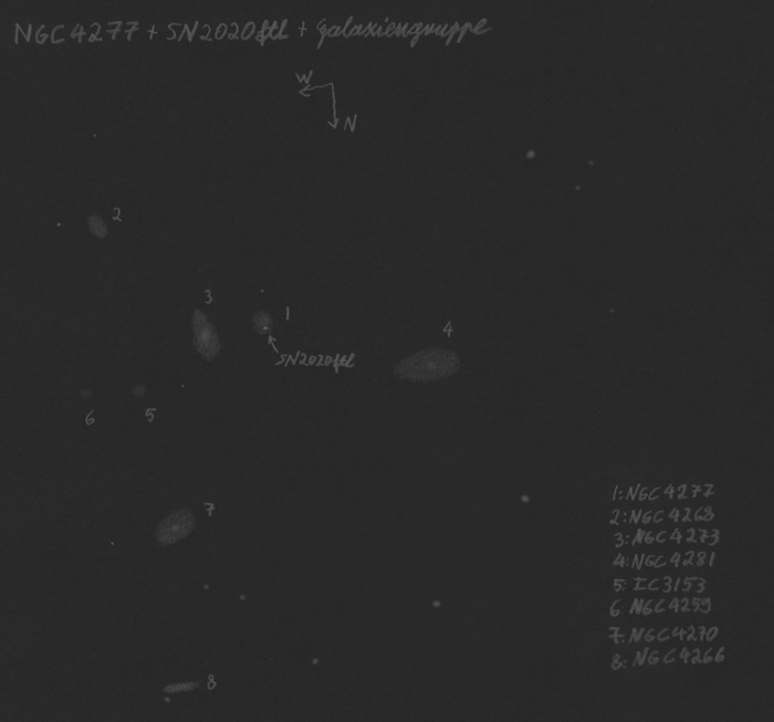 Потому приступил к поиску сверхновой 2020ftl в галактике NGC4277 из созвездия Девы. До окрестностей сверхновой "добрался" легко. Места знакомые, сравнительно неподалеку располагается квазар 3С273.