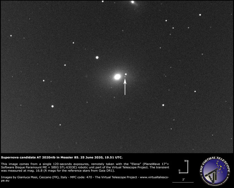 25 июня системой ATLAS на Гавайах была обнаружена возможная сверхновая в галактике М85 в созвездии Волосы Вероники. Блеск транзиента на момент открытия составил 17,44m. Предварительное обозначение AT2020nlb (= ATLAS20qoq). Координаты RA = 12h25m24s.181, Decl. = + 18 ° 12'12 ".52 http://www.rochesterastronomy.org/super ... ml#2020nlbПри расстоянии до родительской галактики 15,2МПк и модуле расстояния 30,8m блеск сверхновой при типе Ia может достигнуть весьма заметной величины 11,5m! Хотя тип возможной сверхновой пока не определен, но галактика относится к типу S0 (линзвовидная галактика) и, соответственно, есть все шансы на тип Ia. Смущает только невнятное изображение транзиента на фото. Будем ожидать дальнейших данных.  Просмотров: 1555