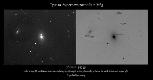 Сегодняшний вечер уделил наблюдению сверхновых. Сначала навелся на окрестности галактики NGC 4457 в созвездии Девы. Небо было ещё светлое, но я терпеливо ждал улучшения условий видимости сверхновой 2020nvb, блеск которой уже превысил 12m. При ее высоте около 15 градусов над горизонтом и относительно темном небе несколько раз на грани глюка удавалось различить в "нужном месте" некое подобие звёздочки, однако полной уверенности в этом нет. Если в ближайшие дни её блеск увеличится до 11m, то вероятность её различить будет намного больше. После этого перенавелся на галактику М85 в созвездии Волосы Вероники. Ближе к 23 часам её высота над горизонтом составляла около 25 градусов. Сама родительская галактика различалась хорошо. Рядом с ней уверенно различалась "искорка", которую можно с уверенностью отождествить со сверхновой AT2020nlb, блеск которой сейчас около 12m. Рядом с ней находится звёздочка около 13m, которую видно не было. Есть вероятность, что эта сверхновая ещё добавит в блеске. Телескоп SW2001, окуляры использовал 6 и 9 мм. С 9 мм окуляром видимость была получше.
