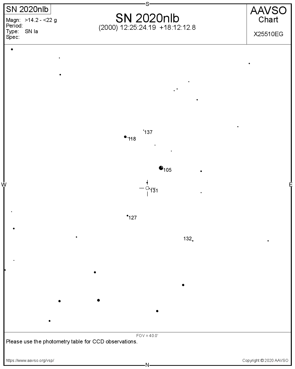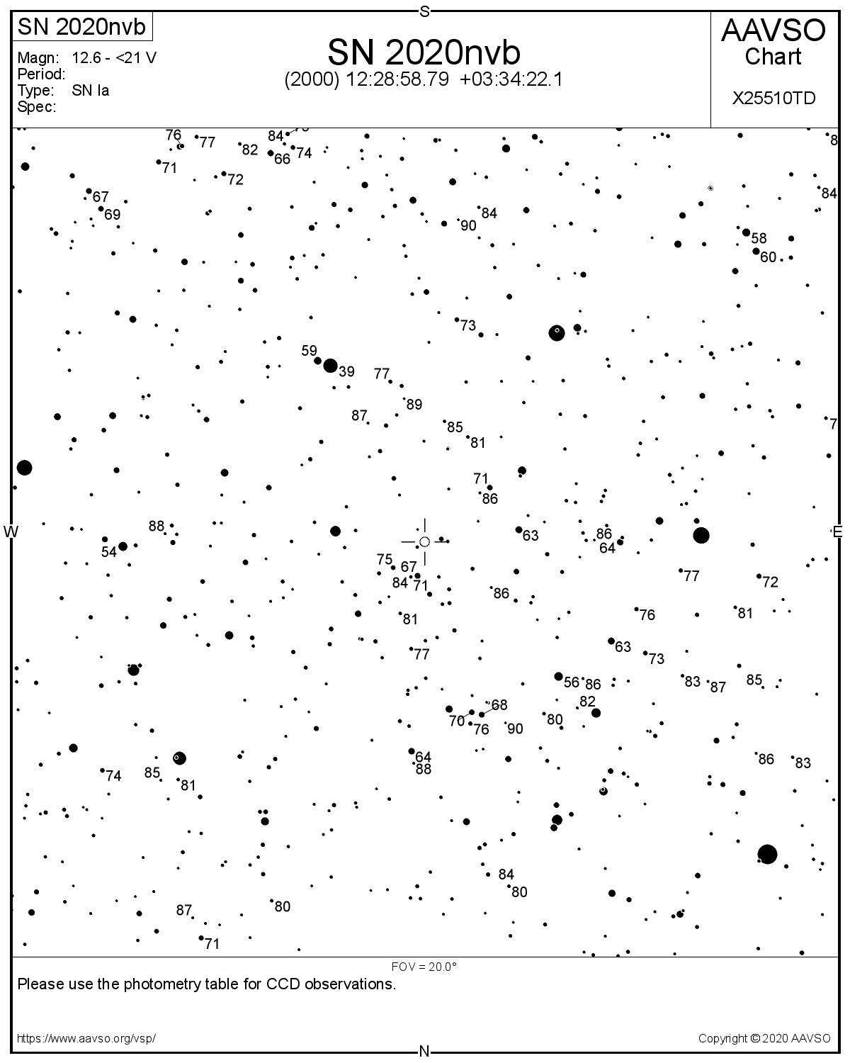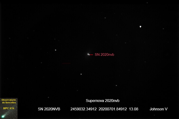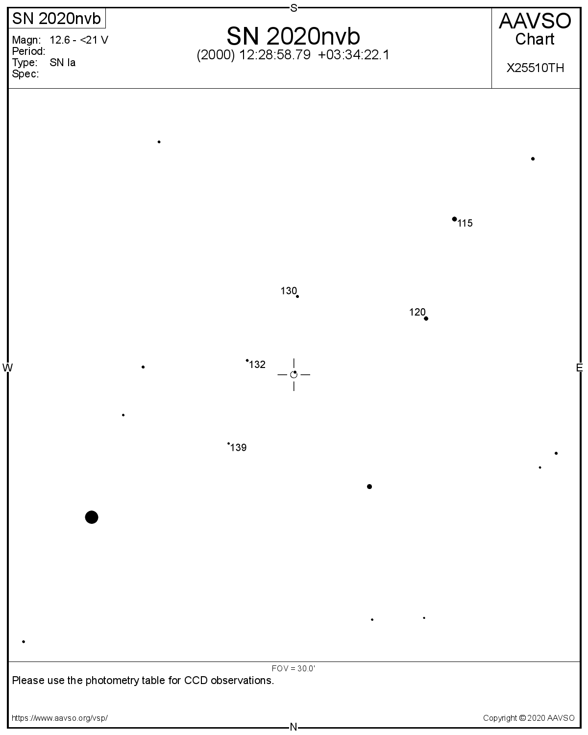 1 июля японским любителем астрономии и заядлым ловцом сверхновых была открыта сравнительно яркая сверхновая в линзовидной галактике NGC 4457 в созвездии Девы. Тип опредлен, как и следовало ожидать, Ia. Блеск на момент открытия составил 13,0m. Предварительное обозначение 2020nvb. http://www.rochesterastronomy.org/super ... ml#2020nvbКоординаты R.A. = 12h28m58s.790, Decl. = +03°34'22".09 При расстоянии до родительской галактики около 12 МПк её блеск в максимуме может достигнуть 11m! К сожалению, созвездие Девы уже сейчас теряется в вечерних сумерках и визуально различить сверхновую будет проблематично...  Фото от Johnson V https://www.facebook.com/photo.php?fbid ... GpGx&ifg=1 Просмотров: 1500