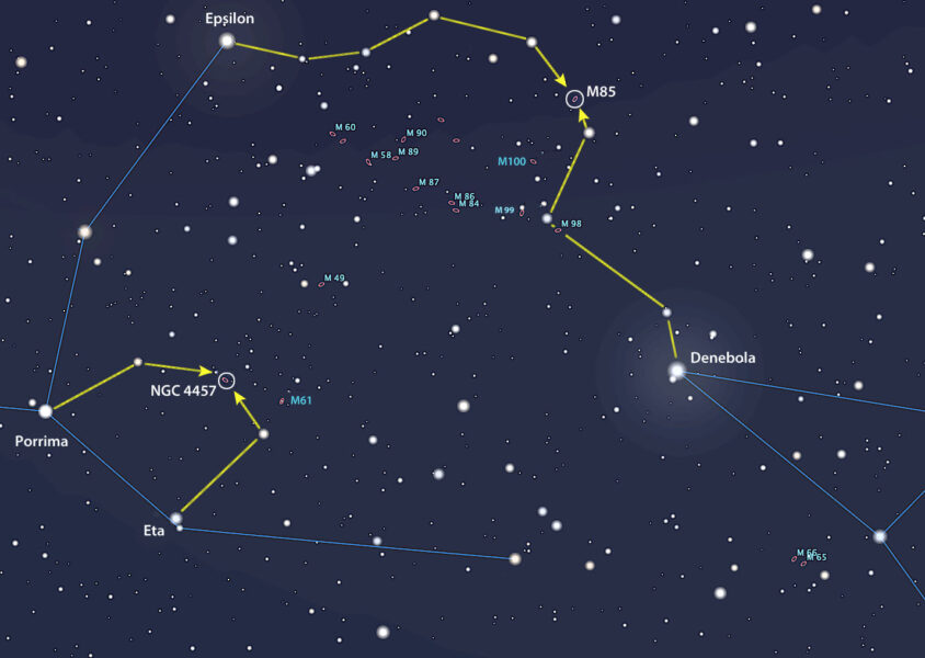 Удобная карта для поиска сверхновых в М85 и NGC 4457, которые все еще находятся вблизи максимума блеска и доступны для 150-200 мм апертуры.  Просмотров: 1292