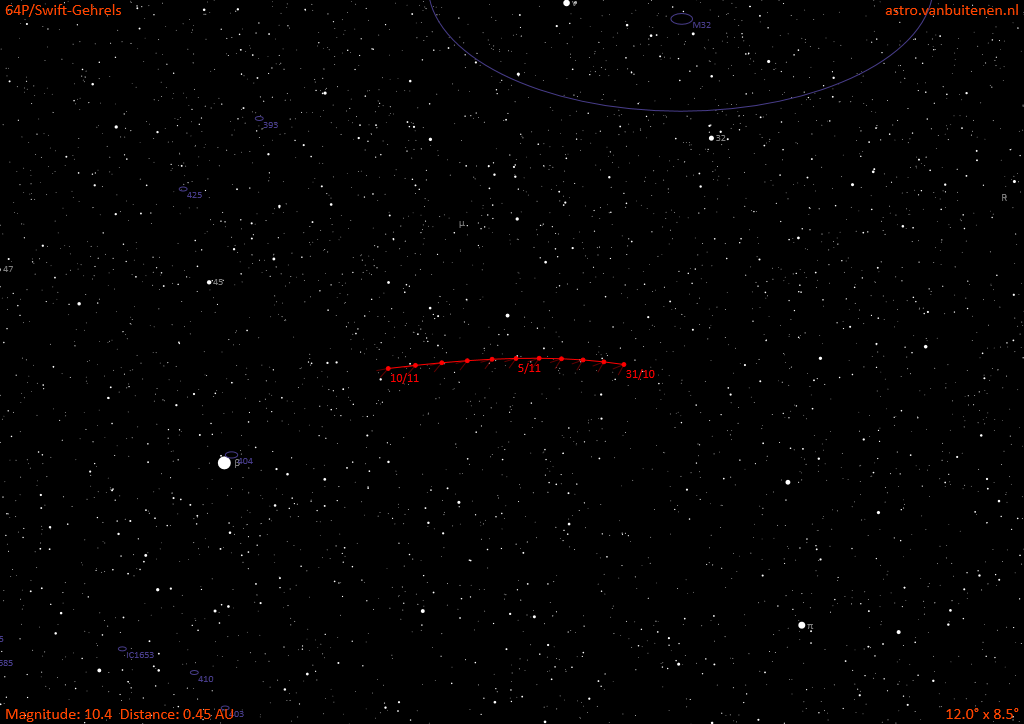 По последним данным Комета 64P Свифта-Герельса достигла блеска 10m. Движется она по созвездию Андромеды в примерном направлении от галактики М31 к звезде Мирах. 28 октября комета сблизилась с Землей на расстояние около 67 млн.км. 3 ноября комета пройдет перигелий своей орбиты. Сегодня к 22 часам небо практически освободились от лёгкой дымки и я в начале потренировался по слабым астероидам с блеском 13,8-13,9m, а затем занялся кометой. Обнаружил её совершенно без труда, используя карту окрестностей. В телескоп SW2001 с окуляром 30 мм выглядела просто туманным пятнышком с усилением яркости к центру. Пробовал также окуляры 17, 9 и 6 мм. Больше всего понравилась комета в окуляр 9 мм (110х). Различалось более яркие ядро и кома. Хвоста не различил. Карта окрестностей.