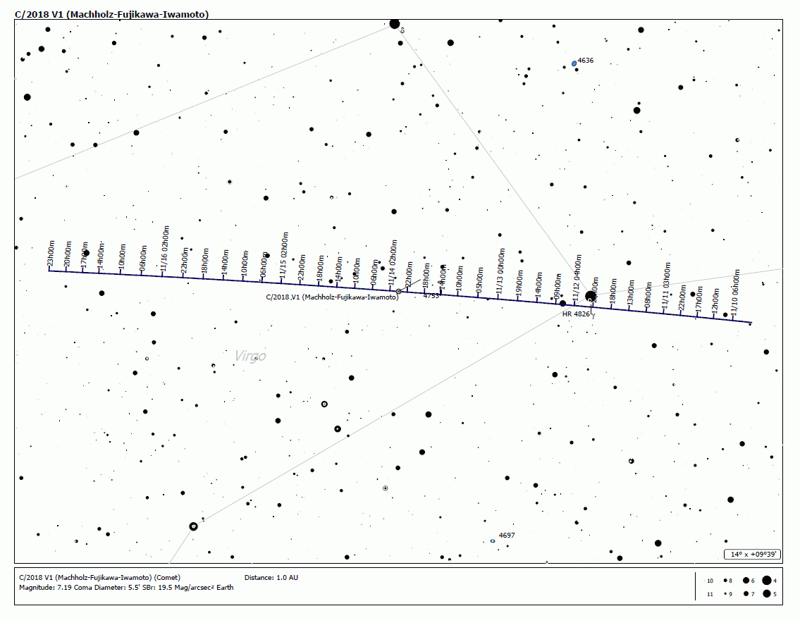 8.11.2018 ЛА Дональд Мачхольц по предварительной информации в созведии Дева визуально обнаружил свою 12 комету !!! Последнее что видел : 5.11.2018 в 3h50m при идеальном небе для города в красной зоне засветки недалеко от оранжевой звездочки 56Gem комету 38P/Stephan-Oterma как предельно слабое пятно. За 20 минут набюдения труба SW1501 - вся в инее ... одежду пришлось сменить на зимнюю.