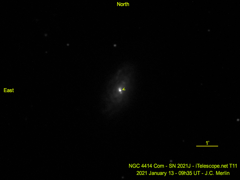 Сверхновую 2021J в галактике NGC4414 удалось увидеть 17.01.2021 в 3:45 по Tk : для SW1501EXOS-2 даже в городе задача оказалась несложной . Несмотря на -18°С и начинающуюся росу-иней в окуляр Celestron X-Cel LX 9mm отлично была видна яркая центральная часть и область рукавов галактики ; проницаемость была не менее 13m. Сверхновая находится в центральной яркой части галактики что делает оценку блеска весьма проблематичной - оринтеровочно ~12,6m .