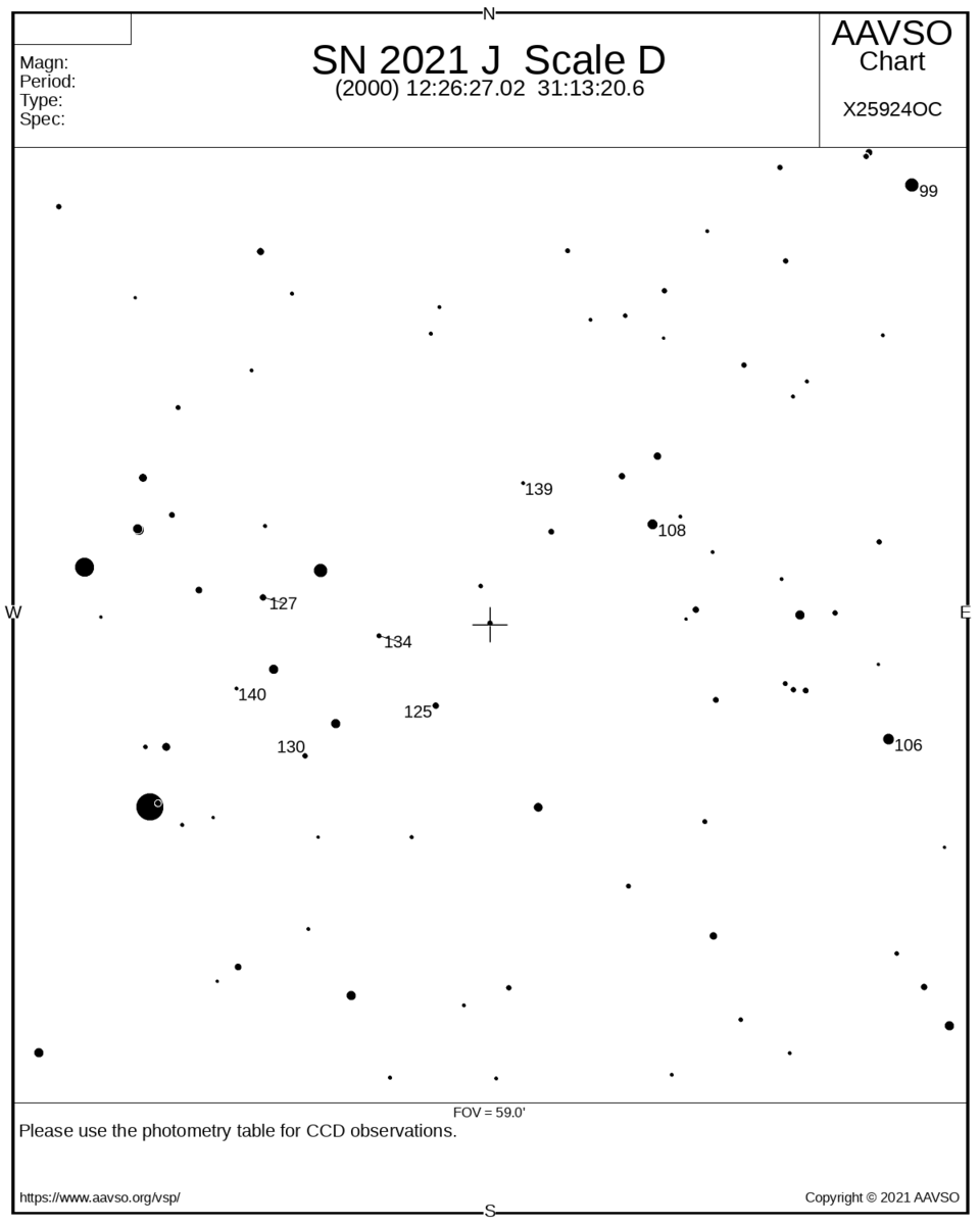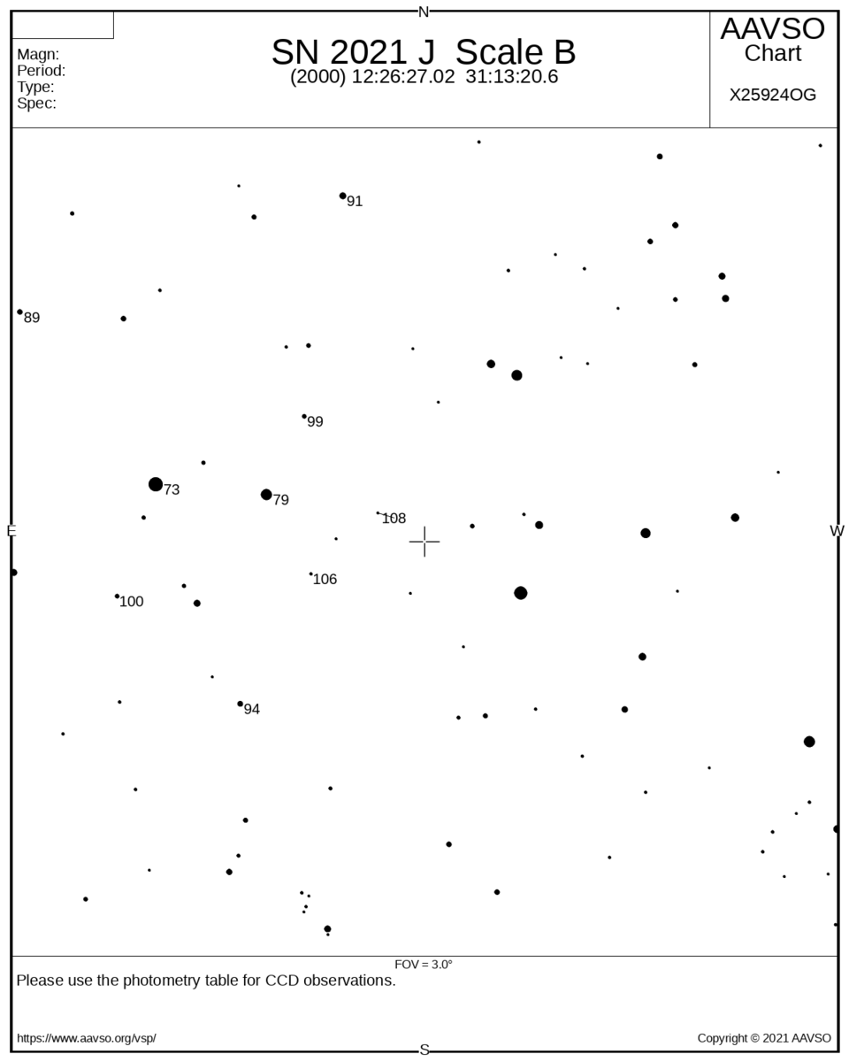 1 января Zwicky Transient Facility (ZTF) в спиральной галактике NGC 4414 из созвездия Волосы Вероники была обнаружена сверхновая, получившая обозначение 2021J. На момент обнаружения ее блеск был 17,1m. Исследование спектра показало тип сверхновой Ia. Координаты: R.A. = 12h26m27s.015, Decl. = +31°13'20".57 При модуле расстояния 31,24 блеск сверхновой в максимуме может превысить 12m. Ранее в этой галактике было открыто две сверхновые SN 2013df и 1974G. В настоящее время блеск сверхновой быстро растет и достиг 13,2m. http://www.rochesterastronomy.org/supernova.html#2021J
