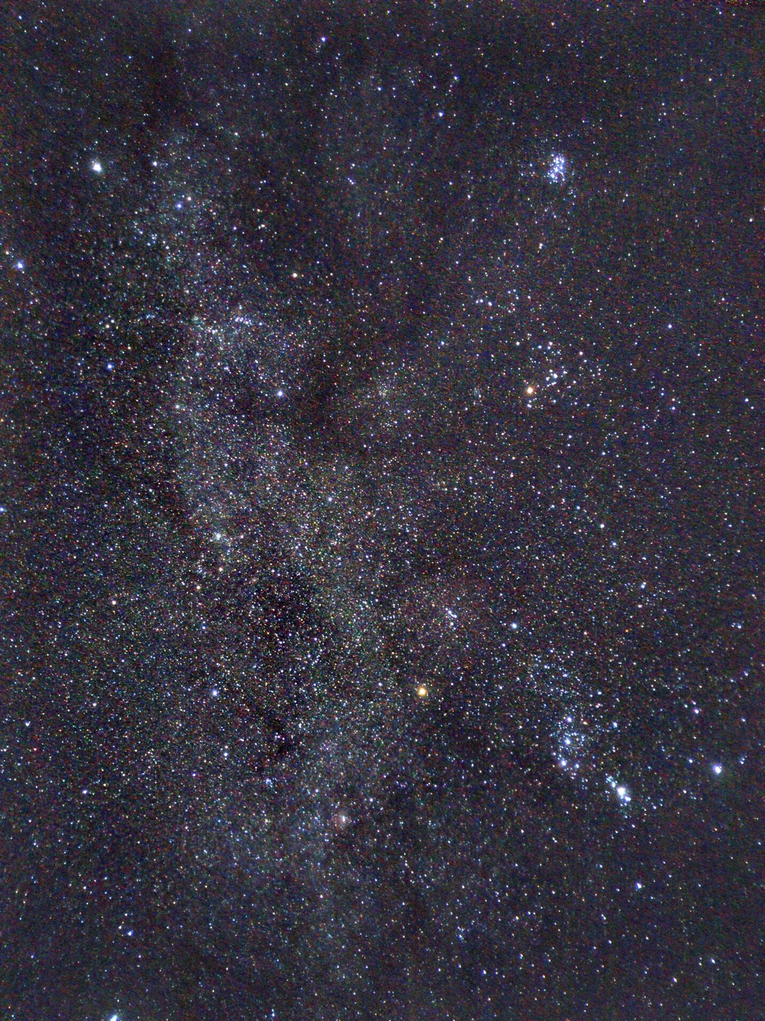 Алексей Локотков писал(а): В нашем городе уже несколько месяцев в подряд отключают по ночам освещение, полностью. Такое звёздное небо я наблюдал только в синей зоне засветки, а теперь наслаждаюсь не выходя из дома. И хоть полный обзор неба у меня только с южной стороны и не ниже 10* , тем не менее в безлунные ночи успевал полюбоваться четвертью небесной сферы  и проявить немного творчества, а именно , по экспериментировал фотографировать на моб. телефон панораму МП. Поместилось три созвездия ( Орион, Телец, Возничий) с основными дипами. P.S. Это поле снимал уже в догонку, быстро уходило за деревья. Потому мало кадров накопил. Уточняю - не выходя со двора частного дома, поскольку выйти из квартиры во двор в комендантский час чревато.