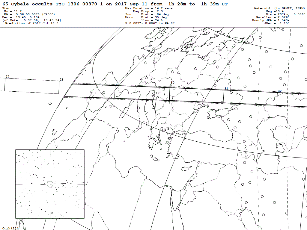 Под утро 11 сентября (понедельник) произойдет покрытие астероидом (65)Cybele при блеске 13,4m звезды TYC 1306-00370-1 (чуть южнее дзета Тельца) с блеском 11,2m. Время покрытия между 04:30 и 04:32 по киевскому времени с максимальной продолжительностью около 14 сек. Широкая полоса (более 240 км) пройдет через центр Украины от Закарпатья до Луганской и Донецкой областей. Полоса захватит Черновцы, Крапивницкий, Кременчуг, Днепр, Полтаву, Харьков, Луганск. Вблизи границы покрытия находятся Ивано-Франковск, Хмельницкий, Винница, Черкассы, Кривой Рог, Запорожье, Донецк. Учитывая близкое положение Луны - 35 градусов при фазе 0,74, наблюдения следует проводить с апертурой не менее 130-150 мм. Поисковые карты окрестностей звезды по ссылке. http://www.asteroidoccultation.com/2017 ... _51500.htm Просмотров: 2323