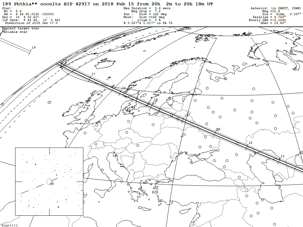 Довольно редкое покрытие произойдет 15 февраля. Астероид (189) Фтия покроет звезду HIP 42917 с блеском 5,6m! Явление при хорошем загородном небе можно будет наблюдать невооруженным глазом! К сожалению в Украине полоса покрытия захватит только маленький северо-восточный кусочек Черниговской области. Полоса покрытия пройдет через ряд крупных городов - Душанбе, Навои, Волгоград, Курск, Вильнюс, Клайпеду, Гетеборг, немного севернее Минска. Время покрытия от 20:02 до 20:18 по всемирному времени. http://www.asteroidoccultation.com/2018 ... _57664.htmhttp://www.poyntsource.com/New/Google/2 ... _57664.HTM Просмотров: 2263