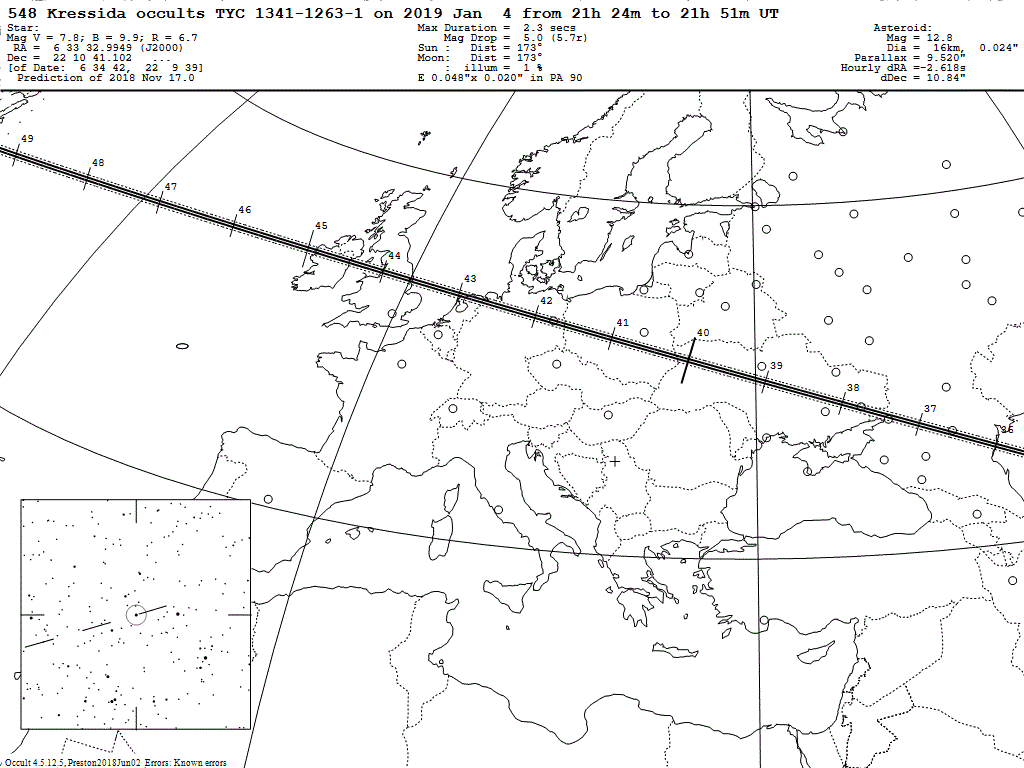 Первая декада января 2019 года в Украине знаменуется целым парадом покрытий звезд астероидами, причем два покрытия будут довольно ярких звезд 7,7 и 7,8m! Вот только неба особо не обещают...  Время везде указано киевское. 1. 4 января в период 23:37-23:40 произойдет покрытие астероидом 548 Крессида с блеском 12,8m звезды TYC 1341-1263-1 с блеском 7,8m в созвездии Близнецов. Продолжительность покрытия до 2,3 секунды, падение блеска 5,0m. Ширина полосы покрытия до 74 км. Центральная полоса покрытия пройдет через Донецк, Павлоград, Кременчуг, Белую Церковь, Ровно и Луцк. Рядом с Днепром, Черкассами, Смелой и Бердичевым. Более подробная информация и карты окрестностей по ссылкам. http://www.asteroidoccultation.com/2019 ... _62640.htmhttp://www.poyntsource.com/New/Google/2 ... _62640.HTM Просмотров: 2096