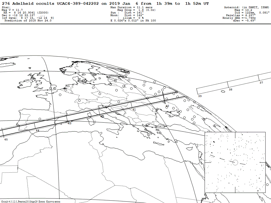 2. 6 января в период 01:40-01:41 произойдет покрытие астероидом 276 Аделаида с блеском 13,2m звезды UCAC4-389-042202 с блеском 11,7m в созвездии Кормы. Продолжительность покрытия до 11,1 секунды, падение блеска 1,8m. Ширина полосы покрытия до 121 км. Центральная полоса покрытия пройдет через Сумы, Немиров, Канев. Более подробная информация и карты окрестностей по ссылкам. http://www.asteroidoccultation.com/2019 ... _58930.htmhttp://www.poyntsource.com/New/Google/2 ... _58930.HTM Просмотров: 2096