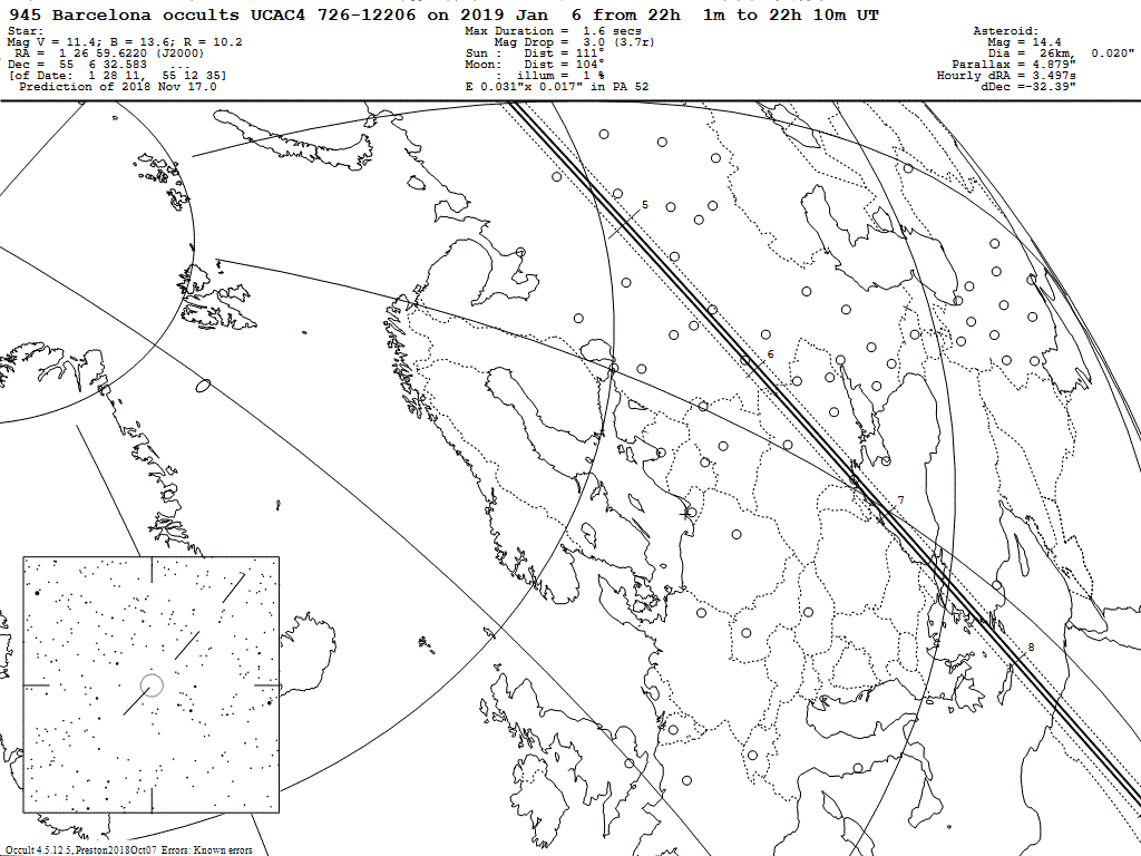 3. 7 января в период 00:06-00:07 произойдет покрытие астероидом 945 Барселона с блеском 14,4m звезды UCAC4 726-12206 с блеском 11,4m в созвездии Кассиопеи. Продолжительность покрытия до 1,6 секунды, падение блеска 3,0m. Ширина полосы покрытия до 25 км. Центральная полоса покрытия пройдет через Сумскую, Полтавскую области, Крапивницкий (по краю), через Одессу и Черноморск. Более подробная информация и карты окрестностей по ссылкам. http://www.asteroidoccultation.com/2019 ... _63192.htmhttp://www.poyntsource.com/New/Google/2 ... _63192.HTM Просмотров: 2096