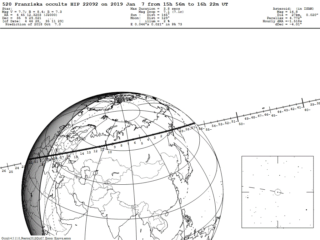 4. 7 января в период 18:16-18:17 произойдет покрытие астероидом 520 Франциска с блеском 14,8m звезды HIP 22092 с блеском 7,7m в созвездии Возничего. Продолжительность покрытия до 3,8 секунды, падение блеска 7,1m. Ширина полосы покрытия до 28 км. Центральная полоса покрытия пройдет через Семеновку, Чернигов, Житомир (по краю). Более подробная информация и карты окрестностей по ссылкам. http://www.asteroidoccultation.com/2019 ... _63198.htmhttp://www.poyntsource.com/New/Google/2 ... _63198.HTM Просмотров: 2096