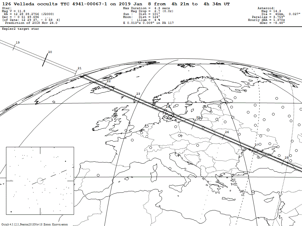 5. 8 января в период 06:26-06:27 произойдет покрытие астероидом 126 Велледа с блеском 14,3m звезды TYC 4941-00067-1 с блеском 11,8m в созвездии Девы. Продолжительность покрытия до 4,3 секунды, падение блеска 2,7m. Ширина полосы покрытия до 5 км. Центральная полоса покрытия пройдет через Нововолынск, рядом с Червоноградом, Броды, Хмельницкий, Николаев и Херсон по краю, Армянск, Красноперекопск, Джанкой. Более подробная информация и карты окрестностей по ссылкам. http://www.asteroidoccultation.com/2019 ... _58964.htmhttp://www.poyntsource.com/New/Google/2 ... _58964.HTM Просмотров: 2096