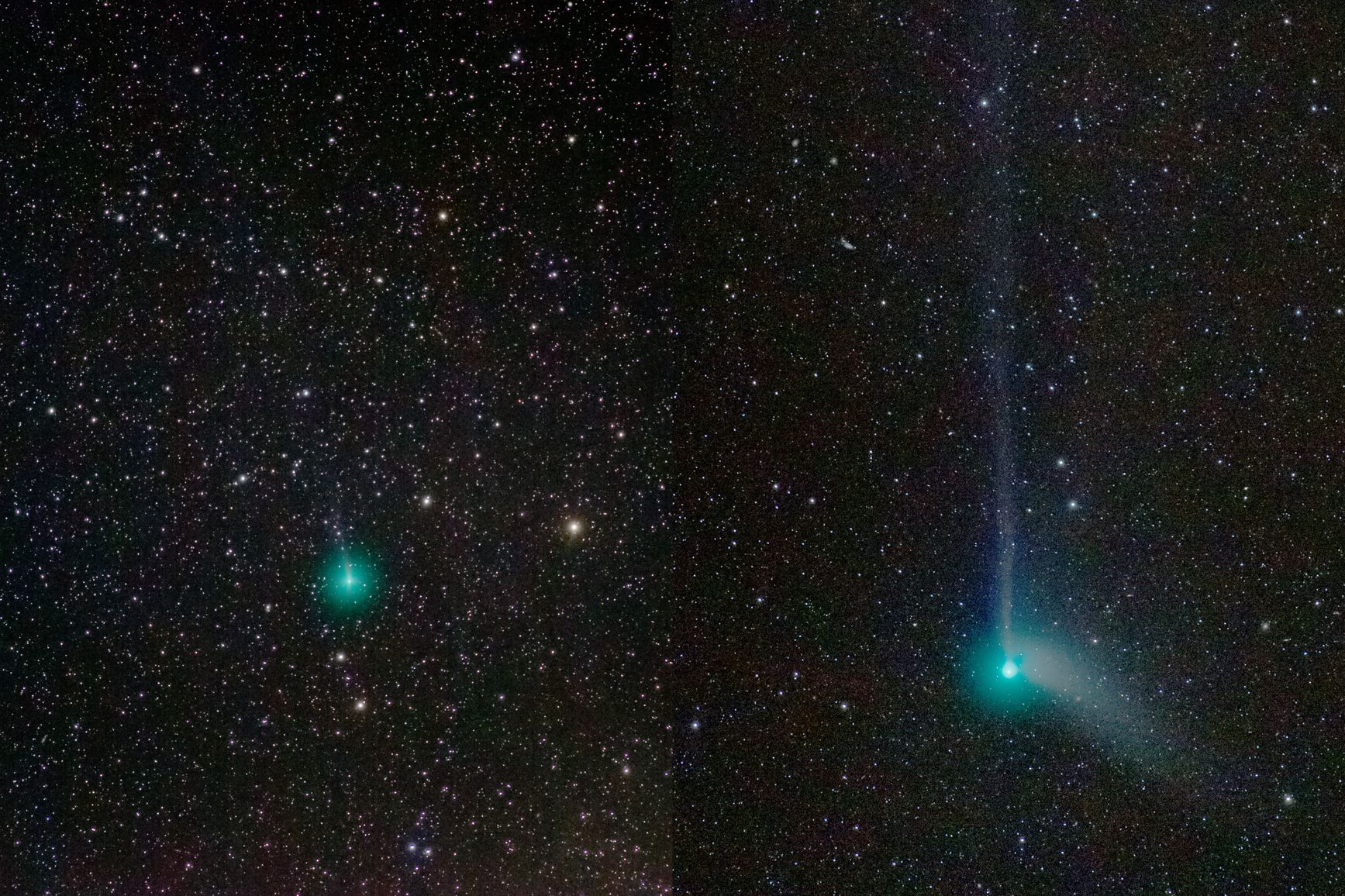 Сравните две кометы января 2016 года, сняты в один день, на одном оборудовнии и в одинаковом масштабе. Слева PANSTARRS (C/2013 X1), справа Catalina (C/2013 US10) Фотоаппарат Canon EOS 6D, объектив EF300mm F2.8L USM, поле зрения 3 на 4 градуса. Автор Yasushi Aoshima, Япония.