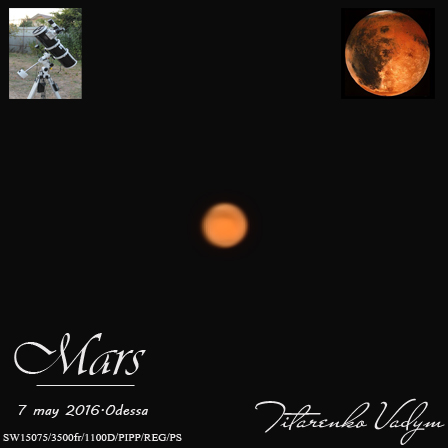 хорошее фото Вадик с учётом положения Марса на небе,да и не стабильной погоды. Я пытался повизуалить,но ничё на Марсе так и не смог разсмотреть,даже ту же полярную шапку. Да и находившийся рядом Сатурн тоже не порадовал. Наверное попал в такую атмосферу.