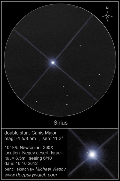 Владимир Станченко писал(а): Вид Щенка при наблюдении в 250 мм ньютон в октябре 2012 года. Автор - Михаил Власов. Израиль. Зарисовка приведена в положении север вверху. При наблюдении в ньютон картинка будет вверх ногами. Щенок будет примерно на 4 часа.
