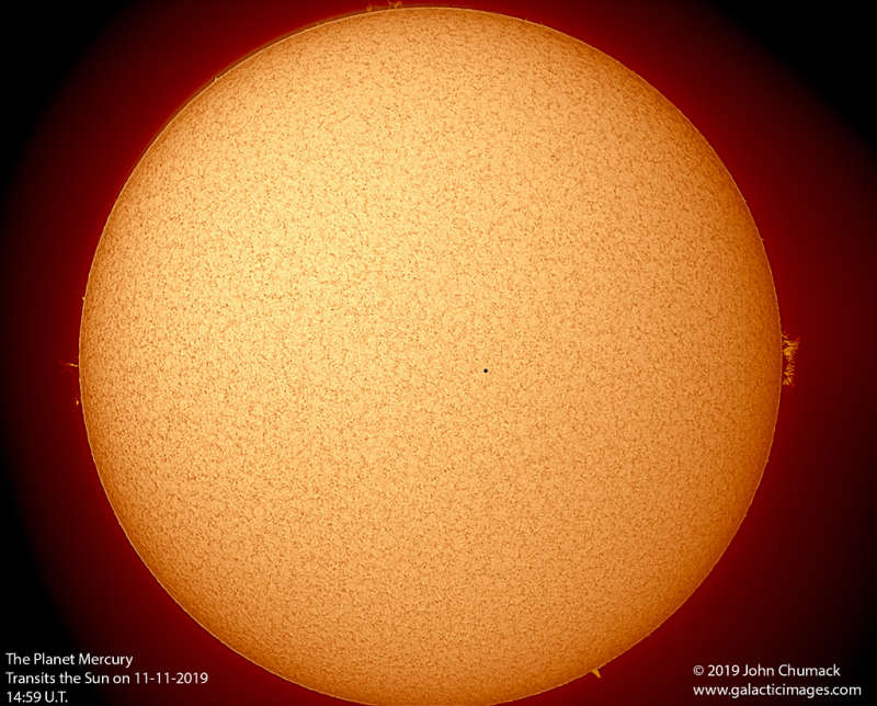 11 ноября 2019 года Солнце было спокойным, так как наблюдается минимум в 11-летнем цикле солнечной активности. Единственным пятном на спокойном солнечном диске была планета Меркурий, которая пересекла его за 5 1/2 часов. Силуэт самой близкой к Солнцу планеты Солнечной системы, размер которого составил всего 1/200 видимого диаметра Солнца, виден около центра этого четкого изображения всего солнечного диска. Снимок был получен с помощью солнечного телескопа с Hα-фильтром, на нем запечатлены протуберанцы над солнечным лимбом – светящаяся плазма, запертая в дуге магнитного поля. Только внутренние планеты Меркурий и Венера проходят перед Солнцем и видны как силуэты при наблюдениях с планеты Земля. После прохождения в 2016 году, это было четвертое из 14-ти прохождений Меркурия по солнечному диску в 21 веке. Следующее прохождение Меркурия произойдет 13 ноября 2032 года. Авторы и права: Джон Чумак