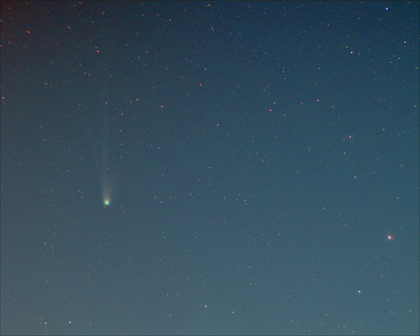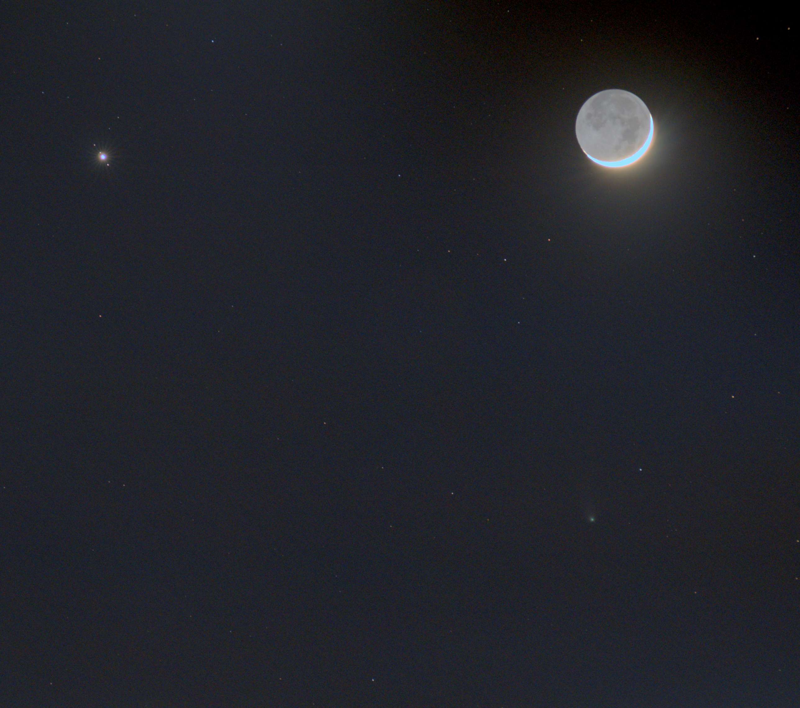 Сьогодні, поки що так. Юпітер зліва вгорі, Місяць праворуч вгорі, і комета 12P/Pons-Brooks справа внизу. Знято з нерухомого штатива з балкона у Харкові.