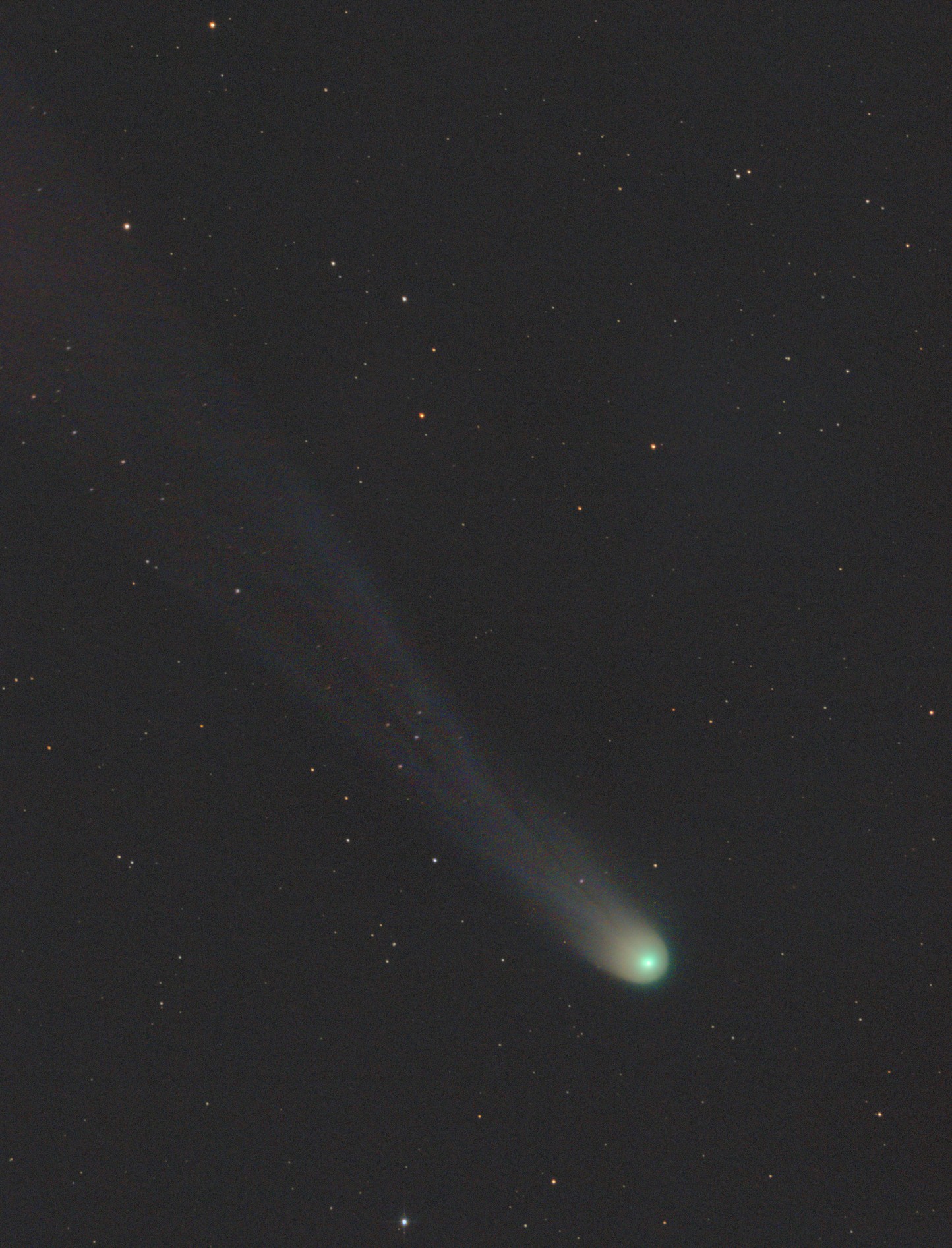 Комета 12P/Pons-Brooks від 3 квітня 2024 року. Знято з нерухомого штатива з балкона у Харкові. Canon 1100D, ТАІР-11 (135/4), складено 310 кадрів по 2сек, iso1600.