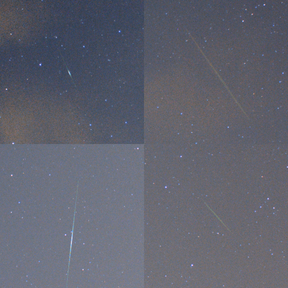 Из фотосессии из 101 кадра, с 21.30 до 22.30, обнаружил три метеора из потока Персеид и одну вспышку спутника. Фотоаппарат Canon EOS 550D, объектив kit 18-55, на фокусе 24мм, диафрагма 4, выдержка 30 сек, ISO3200. Город-миллионик, балкон, красная зона засветки. Сложено 4 кадра (3 метеора + 1 спутника), масштаб 33%