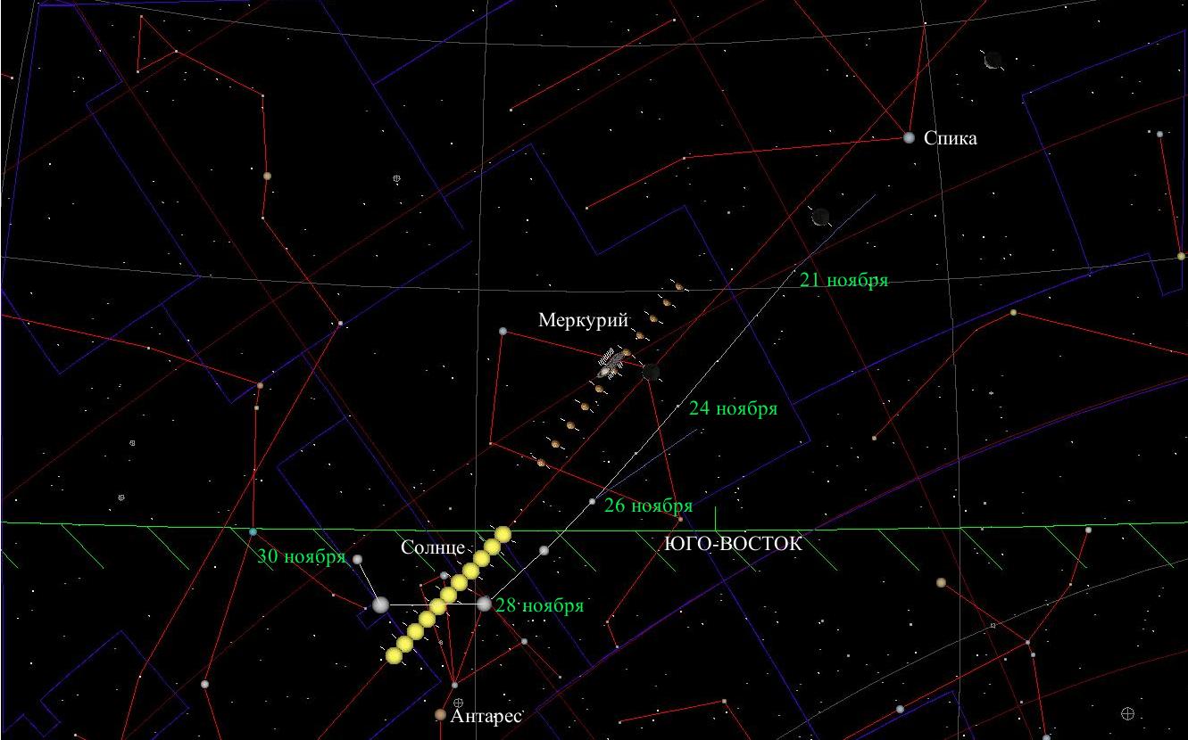 Путь кометы с 21 ноября по 30 ноября 2013 года. Положение относительно горизонта на момент восхода Солнца. Комета перейдет из созвездия Девы в созвездие Весы, а потом в созвездие Скорпиона, где достигнет своего перегелия и резко изменит направление своего движения. Все это время комета находится вблизи Солнца и ее поиск затруднен из-за утренней зари, однако 25-26 ноября можно попытаться наблюдать хвост кометы, который может растянутся на десятки градусов. После перигелия комета начнет наращивать склонение и удаление от Солнца, что существенно улучшит условия ее видимости. Но об этом мы напишем позже.