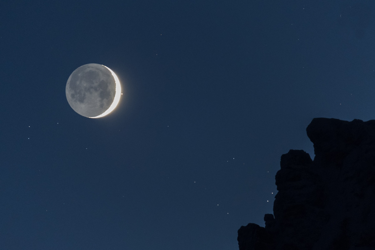 На этом небесном пейзаже Альдебаран запечатлен сразу после выхода из-за яркого лунного лимба. Снимок сделан в начале ночи 28 апреля. На переднем плане – угловатые вершины Доломитовых гор около Ладжио ди Кадоре в Италии. Перед появлением за освещенным Солнцем полумесяцем Альдебаран спрятался позади пепельного света – ночной стороны Луны, слабо освещенной светом Земли. Авторы и права: Джиорджиа Хофер