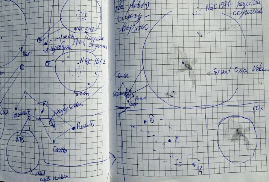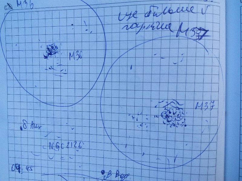 03:30 Повторно зарисовал Плеяды. Набросал карту всего, что ниже Плеяд и в отведенных кружечках схематически изобразил наблюдаемые слабоватые рассеянные скопления NGC 1647, 1662, 1807, 1817 вместе с характерным рисунком более-менее ярких звезд (собственно, характерное расположение фоновых звезд часто дает удостовериться, что наблюдаю нужный объект, только нужно еще менять лево-право из-за зеркала). М1, М78 - больших размеров при 50х, вытянутые пятна. Схематически зарисовал поперечник любимого созвездия Ориона, там прям звездное поле. Целую страницу в дневнике выделил под Большую туманность в Орионе - чрезвычайно красивая "туча" больших размеров, состоит из 3 частей: очень хорошо видно центральную большую часть, которая состоит в свою очередь из областей разной насыщенности; ниже на отдалении более слабая, но заметная область меньших размеров, а выше слабая по яркости часть, которая угадывается интуитивно боковым зрением. 04:00 Далее просмотрел многочисленные рассеянные скопления между созв. Ориона, Близнецов и Тельца, повторно зарисовал М39, а М31 со спутниками показались еще больше и ярче. Далее уже без проблем разобрал М52 (теперь как светлое пятно с ядром из многих звезд), NGC 7789 ( группа звезд на большей площади на светловатом фоне), 7510, 7790, 7788 (рассеянные скопления). 04:30 Хорошо рассмотрел М38 - действительо напоминает морскую звезду, только из 4 ножек. Зарисовал также группу звезд 14-19 Рыб, рассеян.скопления IC410, NGC 1893, 1907, 1931, 2126. Лучше, чем в прошлые разы, были видны также М36 и еще более красивое рассеяное скопление М37, - описал бы их, как наляпистые. Напоследок полюбовался туманностью в Орионе, Двойным скоплением в Персее и красотой Млечного пути.