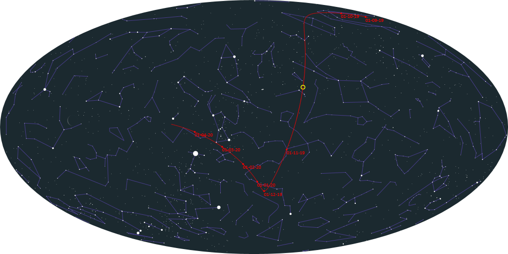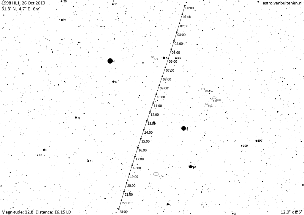 Ещё один потенциально опасный астероид сблизился с Землёй. 25 октября (162082) 1998 HL1 размерами около 0,5-1 км прошел на ближайшем расстоянии в 6,2 млн. км. Его блеск уже превысил 13m и 27 октября достигнет 12,3m, что делает его доступным для наблюдений в сравнительно небольшие телескопы. Он довольно быстро (до 22' в час) движется по небесной сфере с севера на юг через созвездия Андромеды, Треугольника, Овна, Рыб, Эридана. То есть, в ближайшие дни будет располагаться относительно высоко над горизонтом при отсутствии Луны. При благоприятном положении относительно звёзд смещение астероида можно будет заметить в течение нескольких минут.