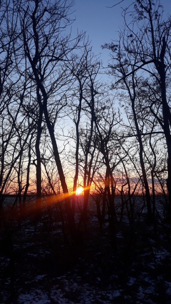 На розвилці вчинив як справжній старпер. Поїхав довго і нудно (зате безпечно) по хріновому асфальту. Неспішно об’їжджаючи численні калдобини. Невдовзі стало зрозуміло, що такими темпами можу не встигнути на феєрію заходу сонця. Такої казковості захід буває тільки в Абіссінії. Іноді, дорога по якій рухався спускалася в балочки. В такі моменти диск Сонця теж опускався, майже торкаючись до верхівок пагорбів. Точніше це пагорби піднімалися стаючи вищими відносно балочок в низинах. Іншим разом, стрічка, так-би мовити асфальту, поступово набирала висоту, здираючись на ті ж пагорби. Від цього Сонечко немов відскакувало від горизонту, обіцяючи що ще деякий час не ховатиметься. Зважаючи на оманливість такого сонячного танцю, не міг правильно спрогнозувати орієнтовний час заходу на потрібній мені місцевості. В серце закралася тривога що можу не встигнути. Все міркував: – Як там той відчайдушний пацан, в суміжній паралельній реальності. Що на минулій розвилці повернув навпростець, по ґрунтовці. Напевно промчав по грязьовій ванні до самого ставочка. Спокійно розпаковує речі на полі з шикарним краєвидом, смакуючи поступове згасання днини. Як тільки жовтогарячий лімб торкнеться горизонту - без поспіху, холоднокровно та впевнено зробить декілька фото. Це будуть його перші трофеї на сьогодні. А я! Тут просто повзу як жук навозний. Вихляючи між ямками. Жорстоко розраховуючись за тимчасову слабкість, що виказав на тій розвилці. Переслідує тепер мене по п’ятам привид безпомічного і прикрого жалю. бездоказових сумнівів у тому, що можливо на тій розвилці, все ж таки, повернув зовсім не туди. 16:46- Не витримав, зупинився, щоб сфотографувати світило на заході, бодай крізь гілля прилеглої лісосмуги. Щоб залишилося бодай втішне на згадку.