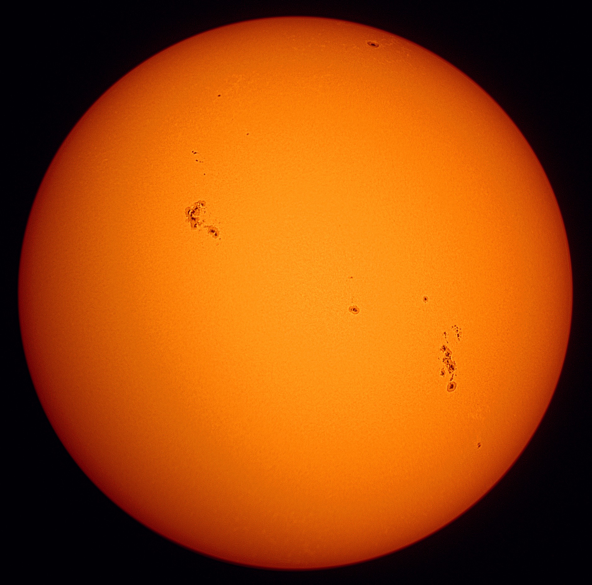 Ради интереса глянул сейчас на Солнце невооруженным глазом через фильтр Astrosolar. Обе крупные группы пятен, особенно южная, вполне различимы невооруженным глазом. Согласно имеющейся информации частенько происходят солнечные вспышки. Очевидно, Солнце находится вблизи максимума активности.