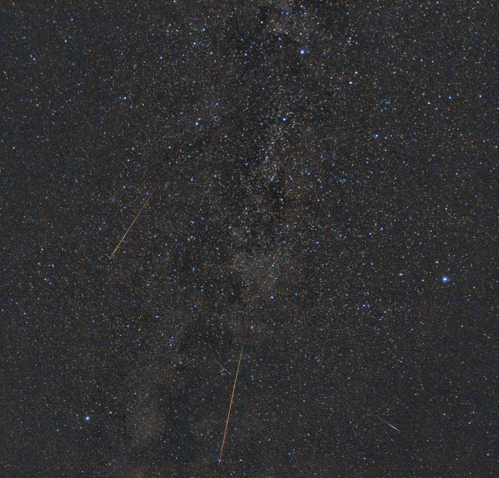 Персеиды-2019 в Летнем Треугольнике. Два достаточно ярких и цветастых персеида пролетели сверху вниз, по направлению от Денеба к Альтаиру, Вега осталась на снимке правее этих метеоров. В правом нижнем углу заметен еще один метеорный трек, он не принадлежит Персеидам, а скорее всего относится к другому метеорному потоку - Дельта-Аквариды. Коллаж. На звездный фон (сумма 20 кадров по 10сек, iso3200) наложены одиночные кадры с метеорами. Canon 550D, kit 18mm/3.5, неподвижный штатив, балкон, красная зона засветки.