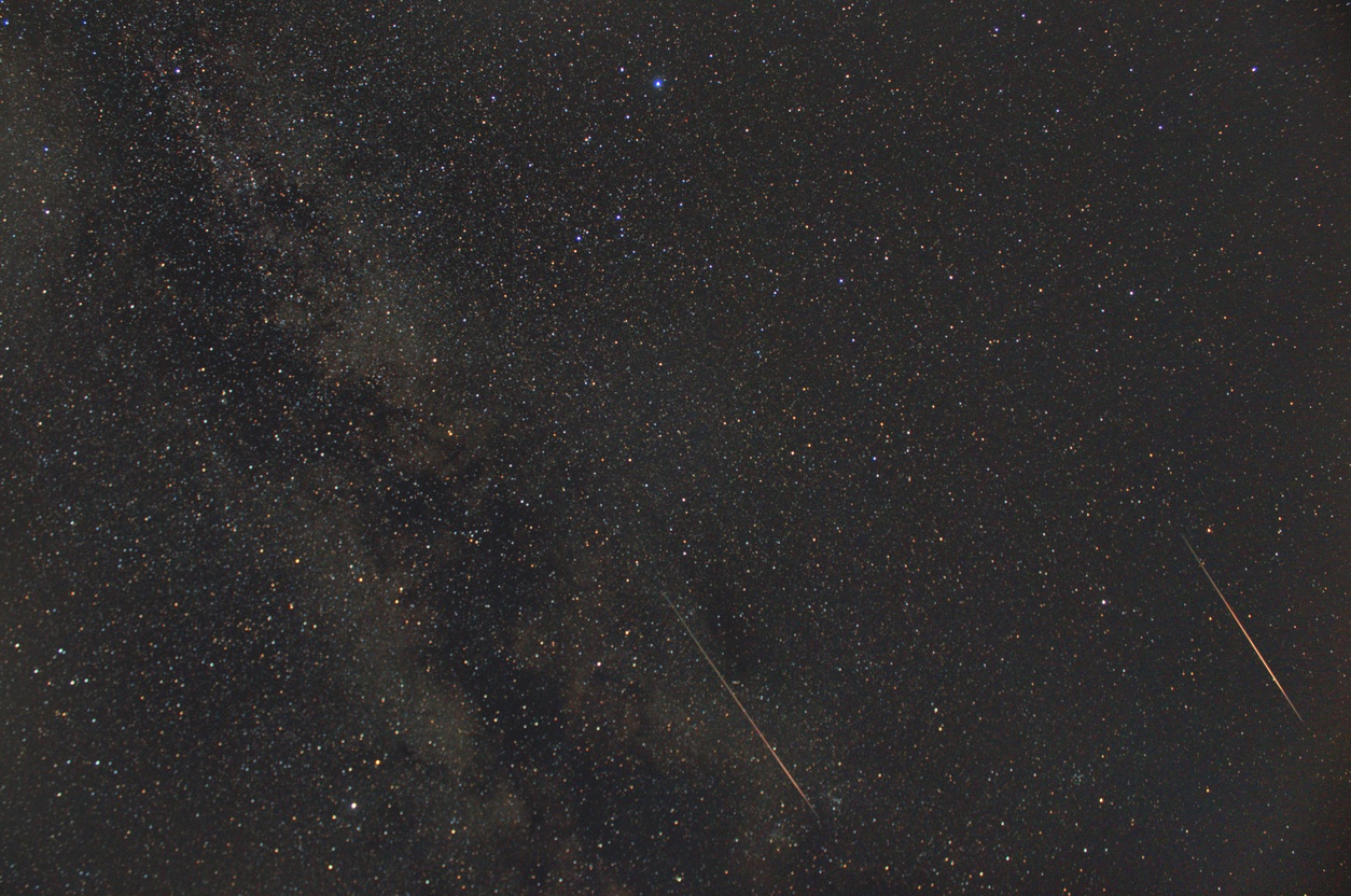 Прошлой ночью, с 12 на 13 августа 2020 года, за час с 1:00 до 2:00, попалось всего два метеора. Canon 1100D, kit 18/3,5, астротрекер, балкон в Харькове.