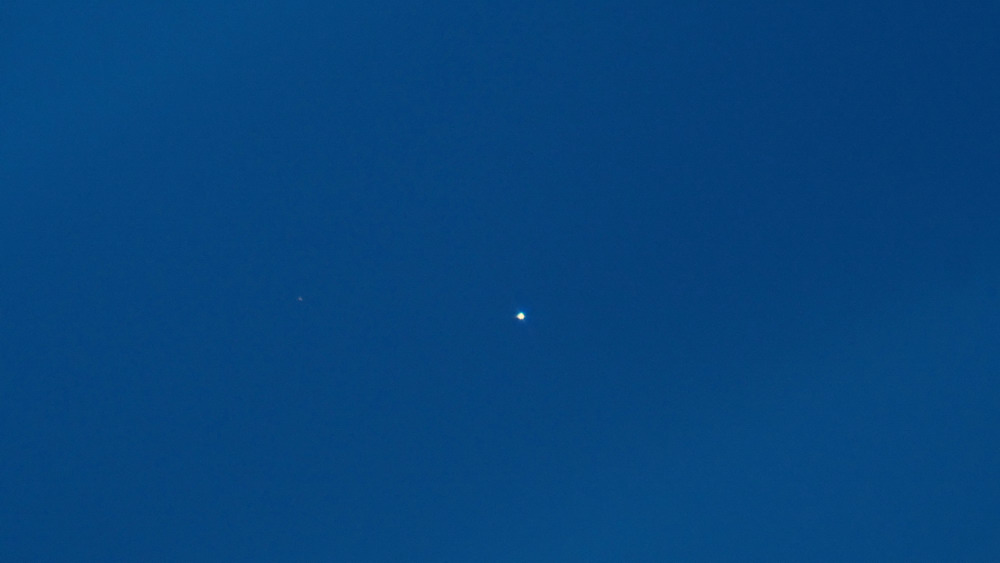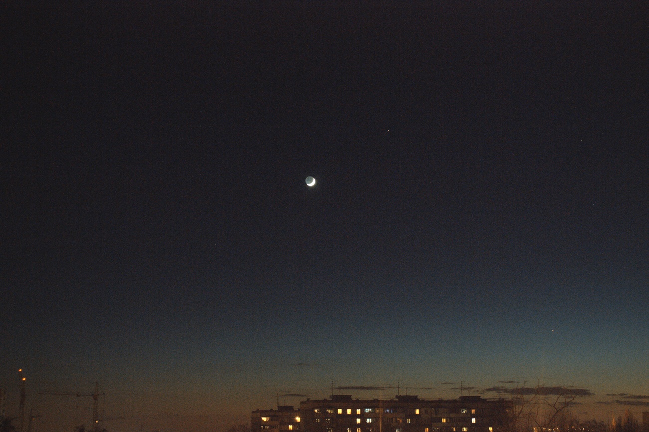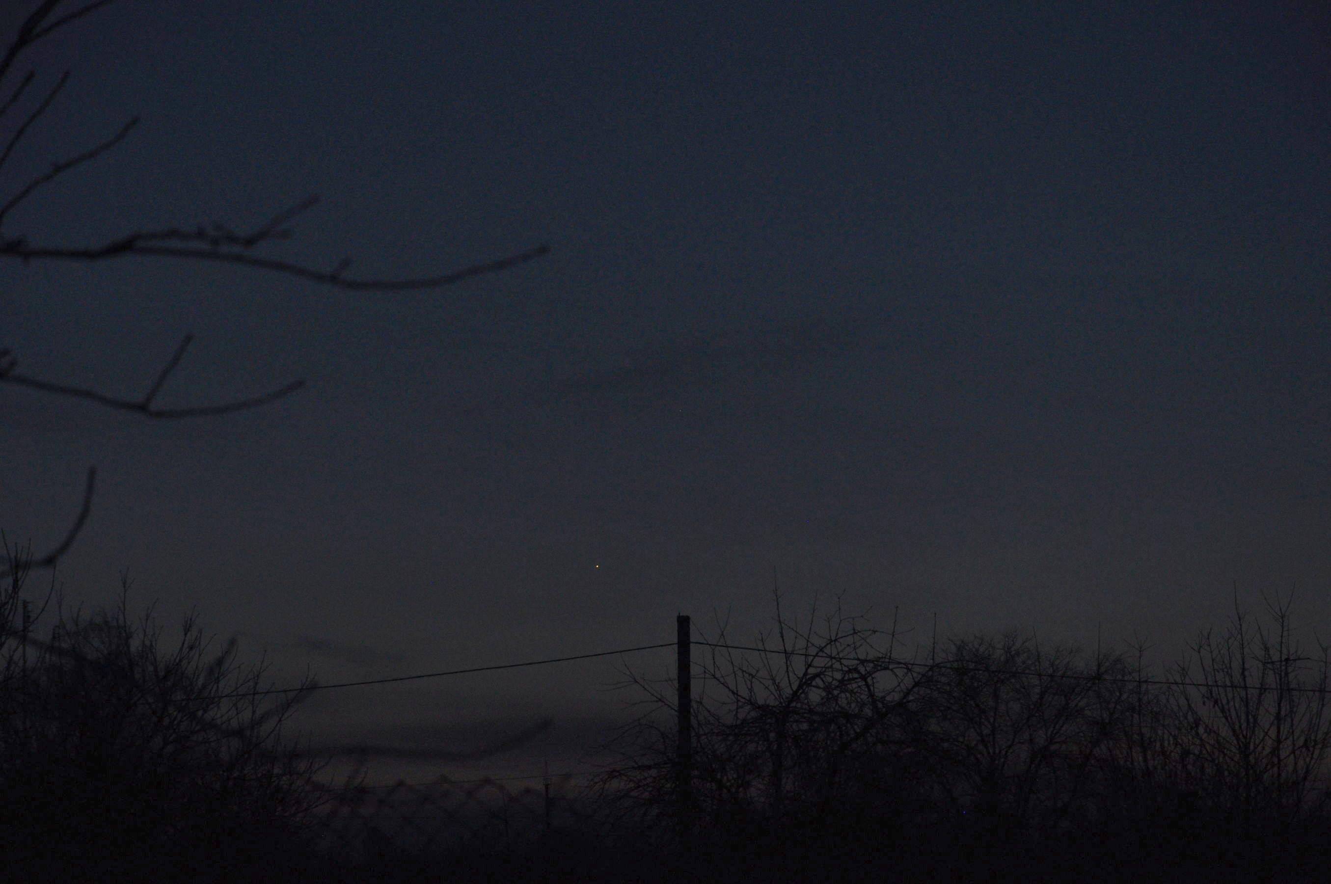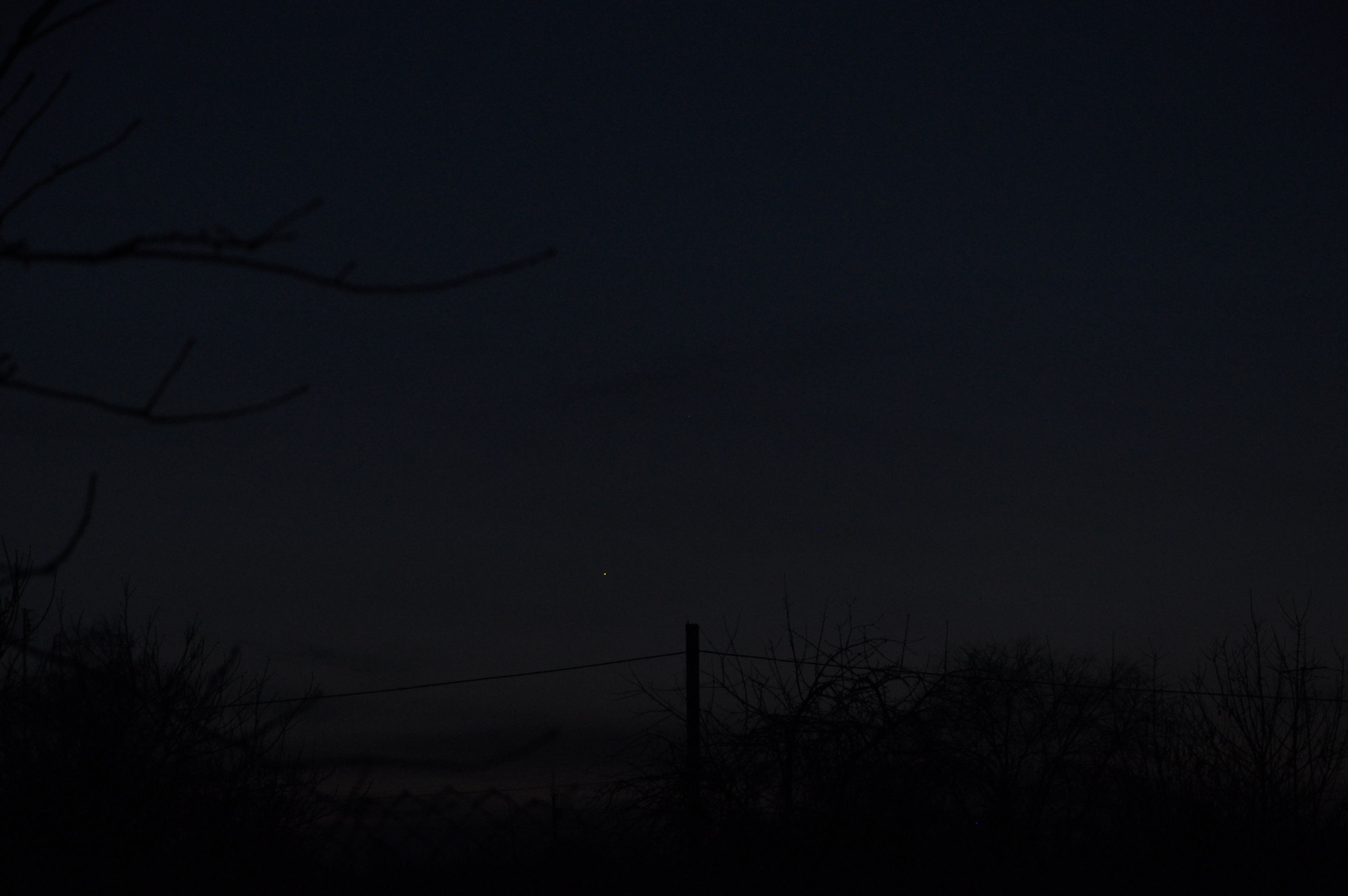 Наблюдал сейчас на сумеречном небе сближение Меркурия и Венеры. Венеру без труда нашёл невооруженным глазом, а Меркурий правее и выше легко был виден в монокуляр МП 7х50 в одном поле зрения. Буквально через 10-15 Меркурий уже без труда виден невооруженным глазом, хотя дымка и легкая облачность не благоприятствует наблюдениям. Сделал на пробу насколько снимков на Никон д90 с китовым объективом (фокусное расстояние 105 мм) прямо с рук.