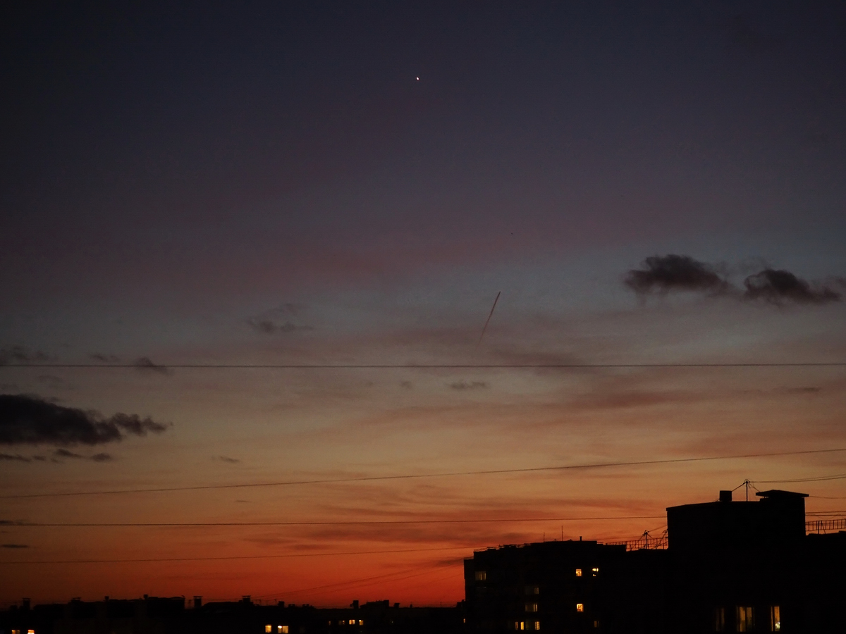 Венера только что прошла момент наибольшей элонгации, находится далеко от Солнца с блеском около -4,4m, видимым размером около 24" и фазе 0,5. На потемневшем небе наблюдал "Вечернюю Звезду" в свой SW2001 с окулярами 6 и 3,8 мм (167х и 264х). Изображение почти не "плыло". Отчетливо было видно потемнение диска вблизи терминатора и более яркий "обод" планеты. Иногда казалось, что отдельные части диска планеты имеют различную яркость. Впрочем, это может быть влияние неоднородностей земной атмосферы. Фаза показалась чуть меньше 0,5, хотя, возможно, это проявили себя "рога" Венеры (свечение атмосферы за пределами терминатора). Как бы там не было, вид планеты впечатлил!