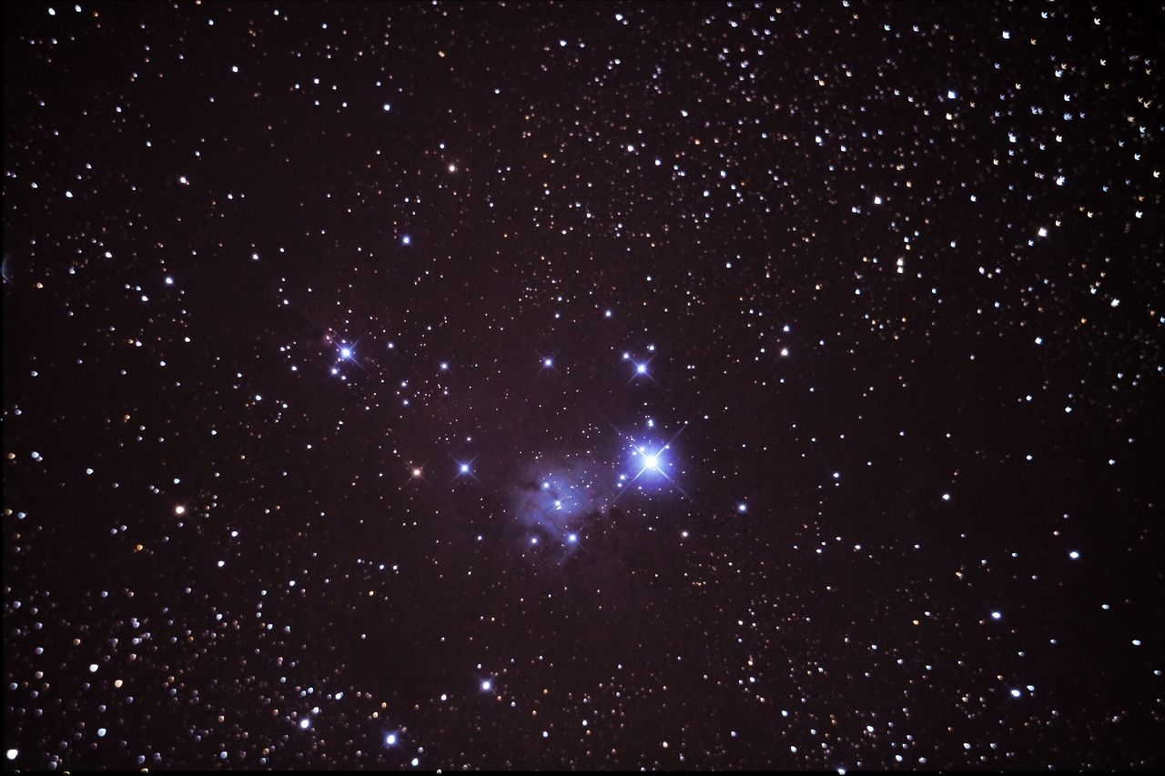 Скопление "37" в Орионе. Это не номер по каталогу, это игра проекции положений звезд на небесную сферу в форме цифры 37 (NGC2169). Скопление яркое, и выглядит замечательно в любую апертуру.