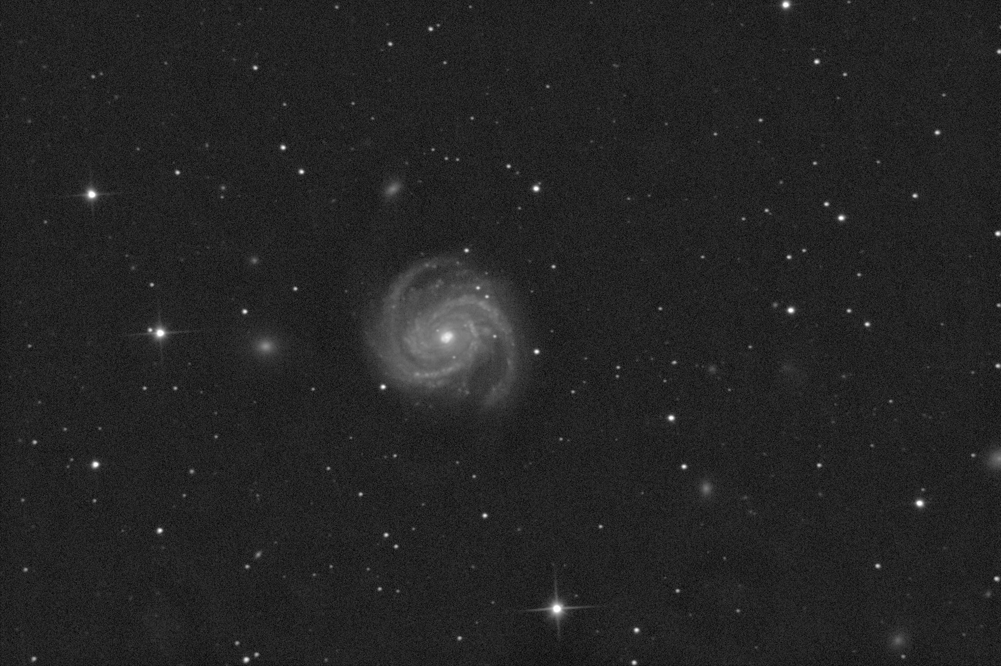 Галактика М100 со сверхновой звездой. Дата съемки: ночь с 5.05 на 6.05.2019 г. Ньютон SW150/750. Камера ZWO ASI 178MM, binning 2. В сложении 58 кадров по 120 сек. с применением алгоритма drizzle 2x c последующим уменьшением до 75%. Север вверху. Харьков. Красная зона засветки. Снимок технический. Для зафиксировать сверхновую.  Просмотров: 918