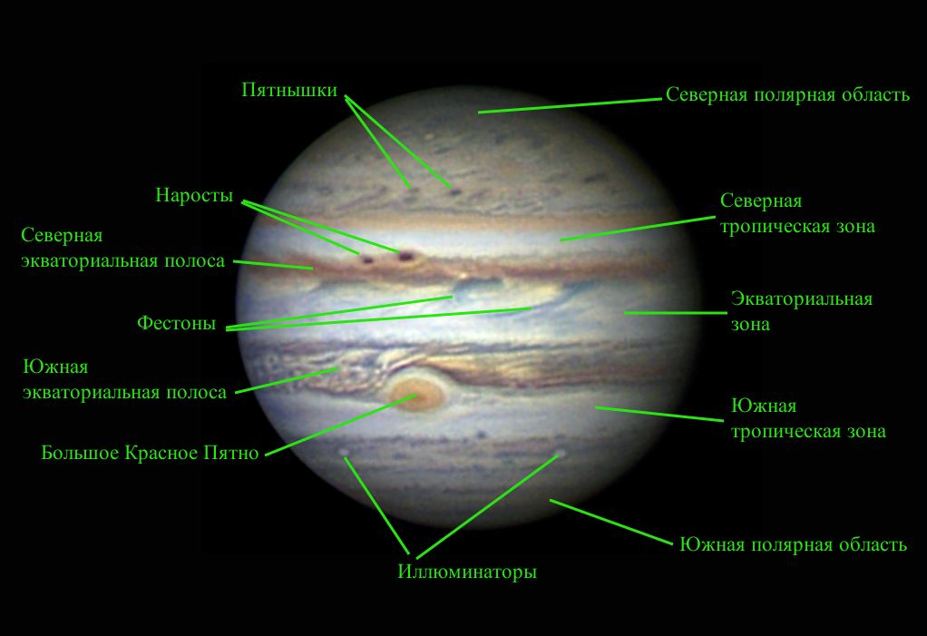 Приведем названия образований на диске Юпитера, наиболее интересных и доступных для наблюдения в телескопы. Для лучшего выделения различных деталей Юпитера рекомендуется использовать цветные фильтры: -синий фильтр усиливают контраст и детализацию светлых зон; -зеленый и голубой фильтры выделяют детали в темных поясах и Большое Красное пятно; -желтый и оранжевый усилят контраст фестонов и полярных областей.