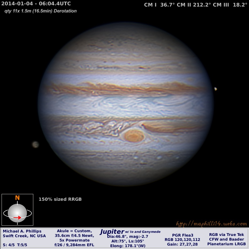 На протяжении декабря 2013 года и января 2014 года планета находится в созвездии Близнецов и доступна для наблюдений в течении всей ночи. Высота Юпитера в верхней кульминации (направление на юг) достигает более 60 градусов над горизонтом. При такой высоте влияние земной атмосферы значительно снижается, что позволяет применять для телескопических наблюдений увеличения близкие к максимальным. В ночь с 5 на 6 января 2014 года произойдет противостояние Юпитера, блеск планеты превысит минус вторую звездную величину и будет более чем в два раза выше блеска Сириуса - самой яркой звезды земного неба, которая будет находится примерно в 40 градусах ниже Юпитера.