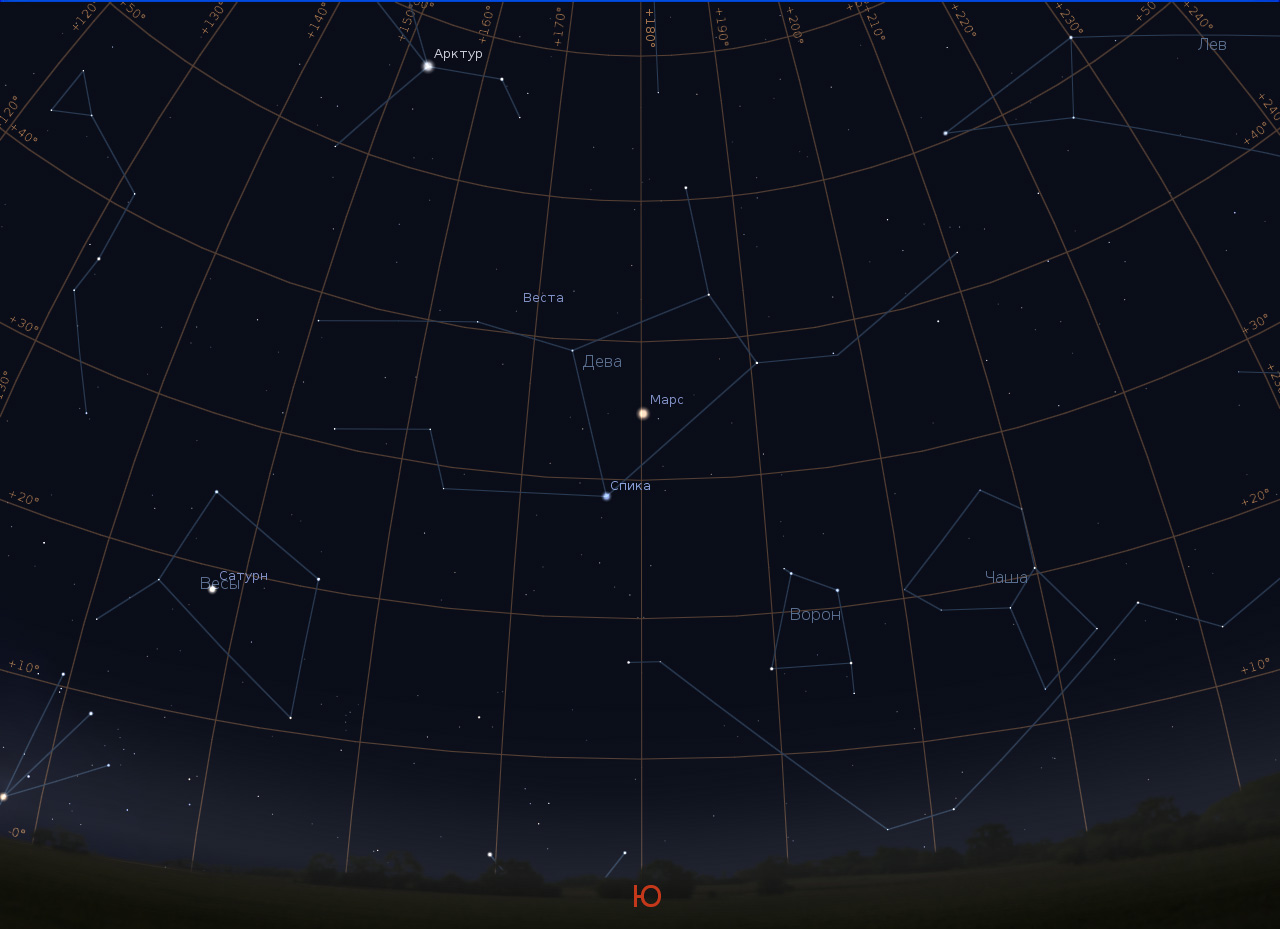 В ближайшие полтора месяца жителям Земли предоставляется отличная возможность для наблюдений «красной планеты» - нашего соседа Марса. На протяжении марта и апреля 2014 года планета находится в созвездии Девы, чуть выше Спики - главной звезды созвездия, и доступна для наблюдений в течении всей ночи. Высота Марса в верхней кульминации (направление на юг) достигает более 35 градусов над горизонтом.