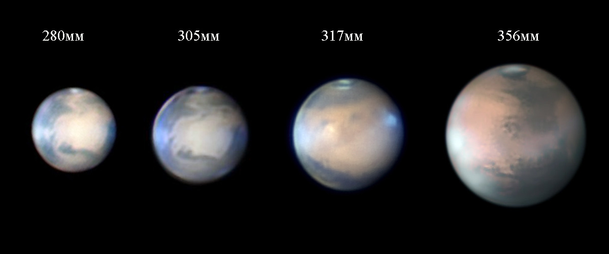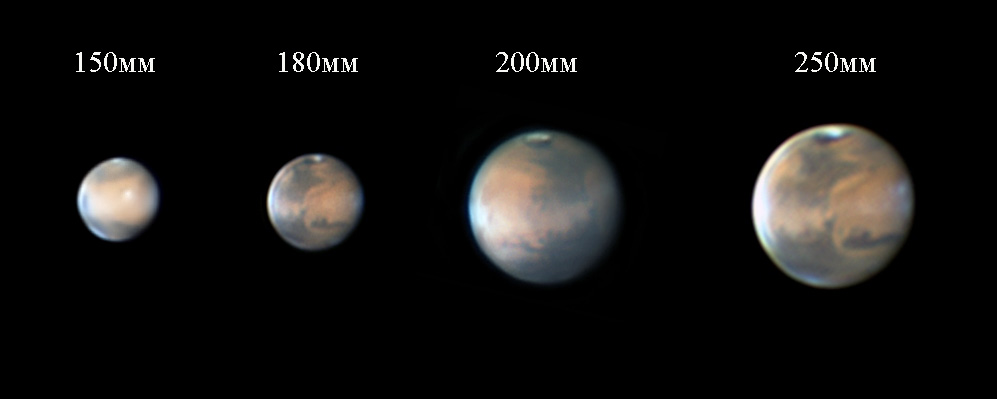 В более крупные телескопы, с диаметром от 150 мм, на увеличениях свыше 150х на диске планеты можно будет рассмотреть много подробностей, а наблюдая за планетой в течении нескольких часов можно заметить вращение планеты. Ниже приведены недавние фотографии Марса, сделанные любителями астрономии (диаметр телескопа указан)