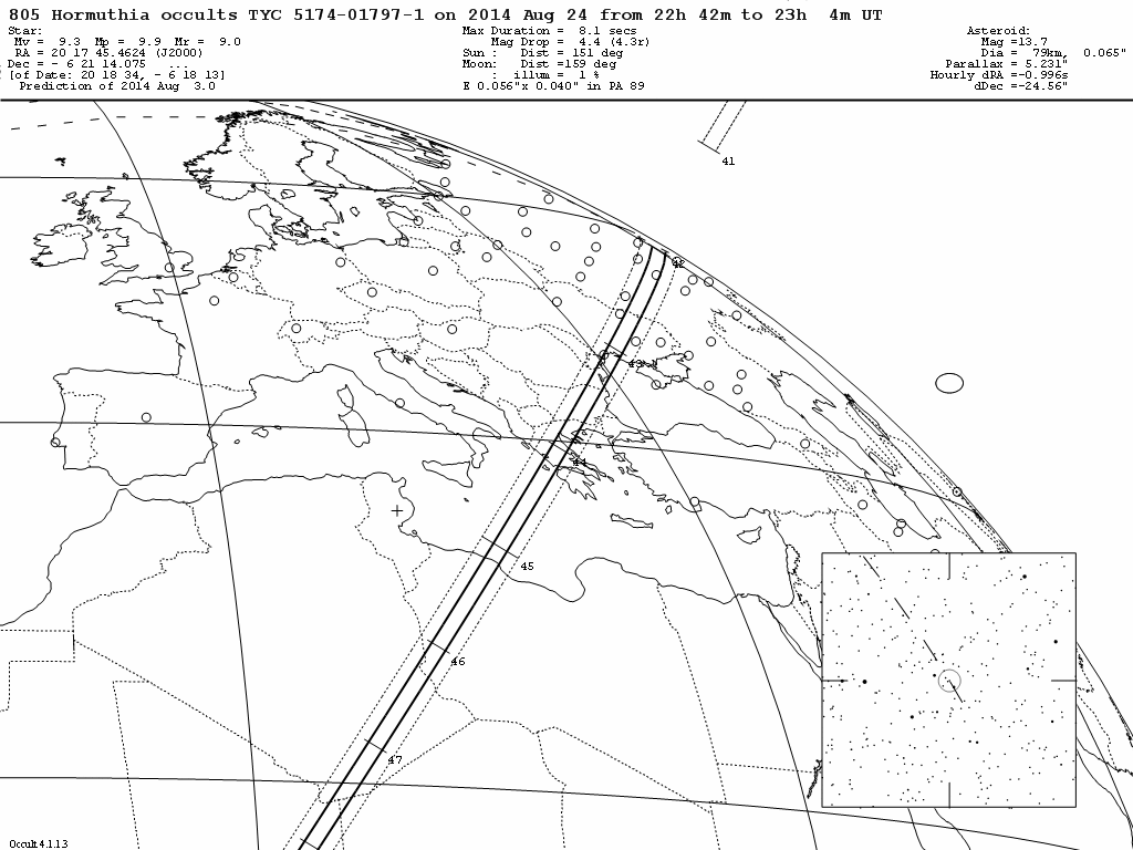 В ночь с 24 на 25 августа 2014 года ожидается покрытие астероидом №805 Гормуция ( блеск mag 13.7) звезды TYC 5174-01797-1 (mag 9.3). Ориентировочное время покрытия 1:42-1:43 по киевскому времени. Максимальная продолжительность покрытия около 8,1 секунды. Покрываемая звезда находится в созвездии Орла и на момент покрытия будет находиться на высоте около 30 градусов над горизонтом. Полоса покрытия пройдет с северо-востока на юго-запад, и северной границей захватит Харьков, южной Днепропетровск, и опять же северной Одессу. Ширина полосы 79 км. ( плюс-минус полсапога разница! )