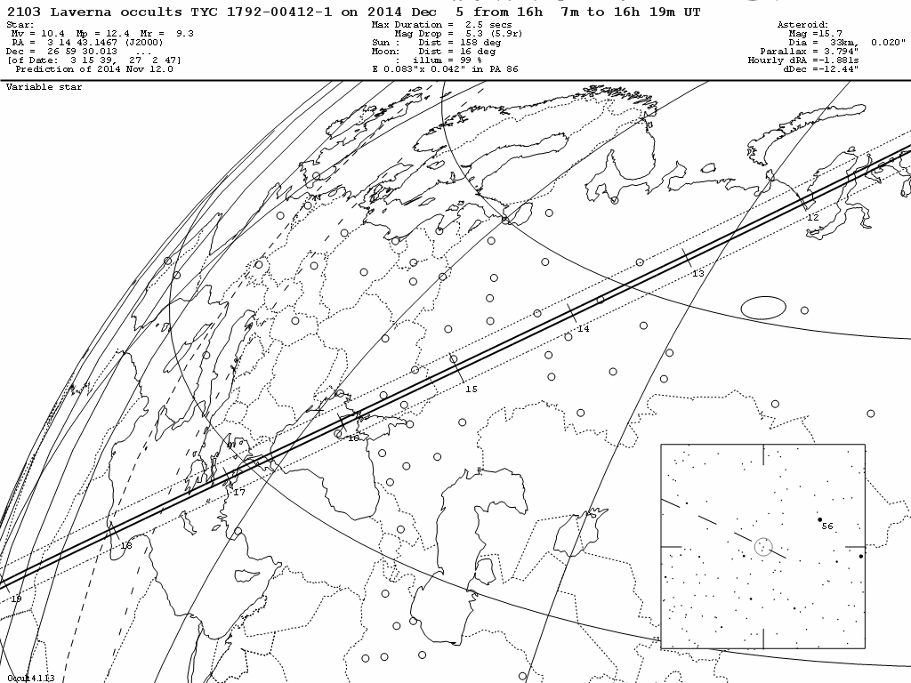 24 декабря между 03:18 и 03:19 по киевскому времени произойдет покрытие астероидом (173) Ino (mag 11.2) звезды TYC 0121-00249-1 (mag 11,3) в созвездии Ориона. Максимальная продолжительность покрытия около 14,1 секунды. Диаметр астероида 161 км. Широкая полоса покрытия! Полоса покрытия проходит через Луганск, Краматорск, Харьков, Полтаву, Прилуки, Киев, Чернигов. Центр полосы проходит через Новую Водолагу! Правда, астероид на 0,1m ярче покрываемой звезды. Потому само покрытие наблюдать будет затруднительно. Прогноз погоды тоже не очень утешительный.