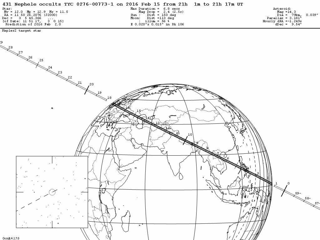 15 февраля между 23:15 и 23:17 по киевскому времени произойдет покрытие астероидом (431) Nephele (mag 14.3) звезды TYC 0276-00773-1 (mag 12,0) в созвездии Девы. Максимальная продолжительность покрытия около 6,8 секунды. Диаметр астероида 79 км. Неподалеку будет находиться Юпитер. Полоса покрытия пройдет через Донецк, Новомосковск (севернее Днепропетровска), Кременчуг, чуть севернее Белой Церкви, Черкассы, Житомир, чуть севернее Ровно и Луцка. Полоса может несколько отличаться от расчетной.