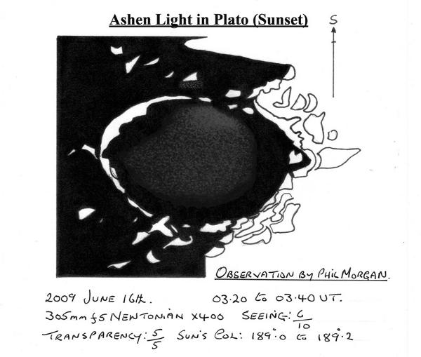 Напоследок хотелось бы упомянуть об интересной оптической иллюзии, которую наблюдал Фил Морган во время захода Солнца над кратером Платон 16 июня 2009 года в 3:20 по всемирному времени. Фил обратил внимание, что в какой-то момент дно кратера резко поменяло свой цвет, и создалось ощущение, что в кратер, как в кофейную чашку, вылили топлёное молоко. Фил провел небольшое исследование и выяснил, что подобное явление наблюдалось и раньше. К сожалению, ему не удалось определить точные условия появления этой иллюзии, но прослеживается некая закономерность. Как правило, Пепельный свет на дне Платона появляется после того, как заходящее Солнце еще подсвечивает острые пики его оправ