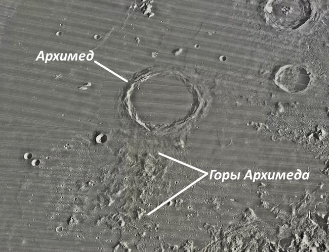 Первый кратер — Архимед(Arhimedes). Благодаря значительному размеру, 85х85 км, Архимед легко виден уже в 60-мм телескоп около восточной границы Моря Дождей и представляет собой классический большой кратер с круглой оправой. К южной оконечности кратера плотно примыкает небольшой горный массив, носящий название «Горы Архимеда». Хорошей ночью с устойчивой атмосферой вид Архимеда в телескоп завораживает. Комплекс «кратер — горы» напоминает гигантского осьминога, плывущего вдоль берега Моря Дождей. Интересен кратер и во время восхода Солнца, когда острые пики восточной оправы отбрасывают длинные тени на его гладкий пол. Для детального изучения Архимеда примените увеличение побольше и внимательно посмотрите, чем отличается Архимед от его собратьев, например кратеров Коперник и Тихо. Первое, что бросается в глаза, — это отсутствие центральной горки и светлых лучей, окружающих кратер. Такой, на первый взгляд, нетипичный для кратеров вид объясняется двумя причинами — местоположением и возрастом кратера. Дело в том, что Архимед — очень древний кратер, который образовался в бассейне Моря Дождей задолго до формирования самого моря. Позже, когда раскаленные потоки лавы заполняли бассейн, они похоронили под собой многие мелкие образования на поверхности Луны, в том числе и лучи вокруг Архимеда. Однако лава не только изменила поверхность вокруг кратера, она хорошо поработала и внутри, скрыв под своим толстым слоем центральную горку и плотно «заасфальтировав» пол.