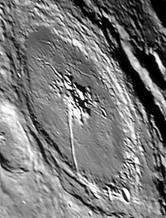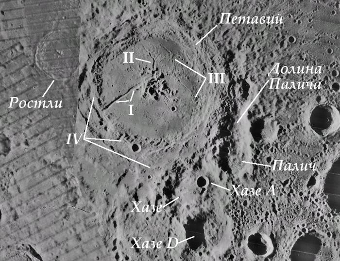 Ну и напоследок окиньте беглым взглядом область вокруг Петавия. Около его восточной границы находится довольно интересное образование — Долина Палича (Vallis Palitzsch), которая отчетливо видна в 100-мм телескоп. Вместе с кратером Палич (Palitzsch) долина напоминает гигантскую кеглю. Теперь переместите взгляд на западную окраину Петавия, где располагается довольно большой (диаметром 60 км) кратер Ростли (Wrottesley). Это типичный кратер ударного происхождения. Конечно, он не такой интересный, как его старший брат, однако у него есть все характерные черты для кратеров такого типа — центральная горка и стены в виде террас. Кратер Хазе (Hase) —- ещё одна местная достопримечательность — подпирает Петавий с юга. Хазе практически стерт с лица Луны. Кратер Хазе А исковеркал его восточную часть, а падение достаточно массивного тела, приведшее к образованию Хазе D, полностью разрушило его южную стену.