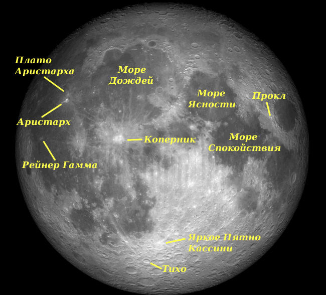 Однако Тихо — не единственный кратер с лучевой системой, видимый в полнолуние. Среди кратеров-гигантов без особого труда можно найти Кеплер, Аристарх и Прокл. Что интересно, Прокл (Proclus) — 29-километровый кратер, расположенный на западной границе Моря Кризисов (Mare Crisium) — в моменты, когда терминатор располагается неподалеку от него, выглядит заурядным и ничем не примечательным. Но под прямым солнечным светом его лучи становятся отчетливо видны. Даже беглый осмотр показывает, что вокруг кратера существует достаточно большая зона, лишенная лучей. Такая аномалия имеет простое объяснение: Прокл сформировался в результате скользящего удара, при котором образовавшее лучи вещество в основном разлетелось по поверхности в направлении полёта тела и лишь немного — по сторонам. Продолжая тему кратеров, имеющих лучевую структуру, давайте взглянем на Коперник (Copernicus). Коперник — гигантский кратер (93 км), окруженный красивым комплексом лучей, которые в сравнении с аналогичными у Тихо менее очевидны и не настолько длинные. Такое различие объясняется разницей в возрасте обоих кратеров. Коперник гораздо старше Тихо, и соответственно, его лучевая система намного дольше подвергается внешним воздействиям и потихоньку исчезает с поверхности Луны. Неподалёку от Коперника располагается ещё она лунная достопримечательность — Аристарх (Aristarchus). Этот кратер — самое яркое лунное образование, видимое с Земли. В обычный бинокль я без труда могу рассмотреть Аристарх как ослепительно яркую точку на лунной, и без того яркой, поверхности. Такая яркость самого кратера и окружающих его лучей говорит о том, что Аристарх — относительно молодое образование, возраст которого оценивается в 500 миллионов лет. Не менее интересно посмотреть на ромбовидное основание, на котором расположился кратер. Плато Аристарха (Aristarchus Plateau) возвышается примерно на 2 километра над окружающим его морем и имеет едва уловимый красноватый оттенок. Проверьте, удастся ли вам его разглядеть? Еще одна яркая деталь на Луне, так называемое Яркое Пятно Кассини, располагается северо-восточнее Тихо. Как следует из названия, впервые внимание научной общественности к этому образованию привлёк Жан Кассини. Многие наблюдатели того времени говорили о некоем таинственном «белом облаке», которое можно наблюдать вблизи полнолуния. Правда, позже выяснилось, что «белое облако» вовсе не облако, а совершенно обычный молодой кратер диаметром 3 км, имеющий крошечную систему лучей. Теперь поставьте увеличение побольше и внимательно осмотрите южный край Луны. Видите выступающие неровности на краю диска? Это типичные лунные горы, которые в действительности представляют собой больше холмы. Полнолуние — хорошее время для общего изучения лунных морей. В небольшой бинокль отчетливо видно, что моря, как и другие кратеры, имеют более или менее округлую форму. Около 4 миллиардов лет назад Луна находилась под жесткой бомбардировкой крупными астероидами и кометами, благодаря чему и образовались кратеры. Но среди тысяч врезавшихся в Луну больших и маленьких глыб было несколько поистине гигантских, которые оставили шрамы на её поверхности диаметром не в одну сотню километров. Затем раскаленная лава медленно заполняла эти воронки и, застыв, образовала то, что мы сейчас называем лунными морями. На первый взгля