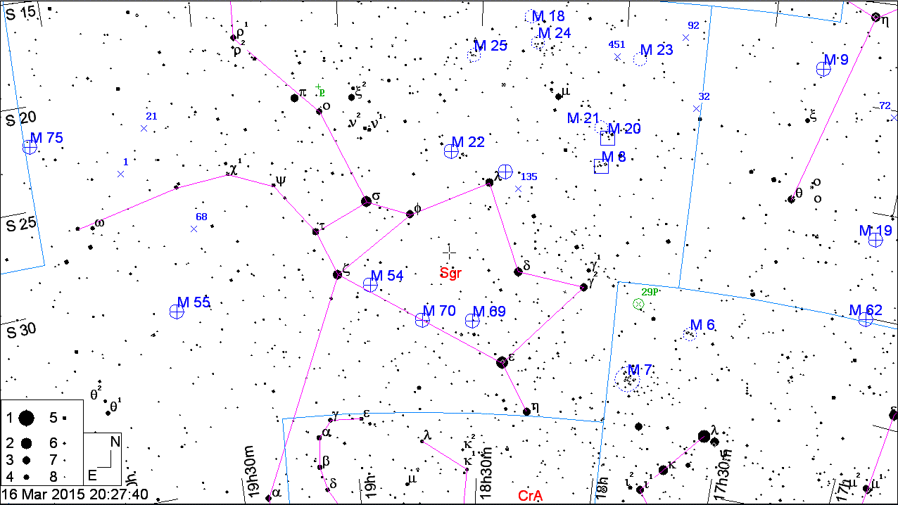 Сегодня утром около 04:30-04:40 наблюдал Новую Стрельца. Невооруженным глазом не различалась, небо было уже довольно светлое. В монокуляр МП7х50 уже различалась, в искатель 9х50 была видна получше. В 200-ку с окуляром 17 мм (60х) Новая была видна хорошо и выглядела значительно ярче звезд 6,4 и 6,8м, расположенных в одном поле зрения. Ориентировочно блеск Новой можно оценить около 5м. Для её наблюдения необходимо иметь чистый горизонт на юго-юго-востоке.