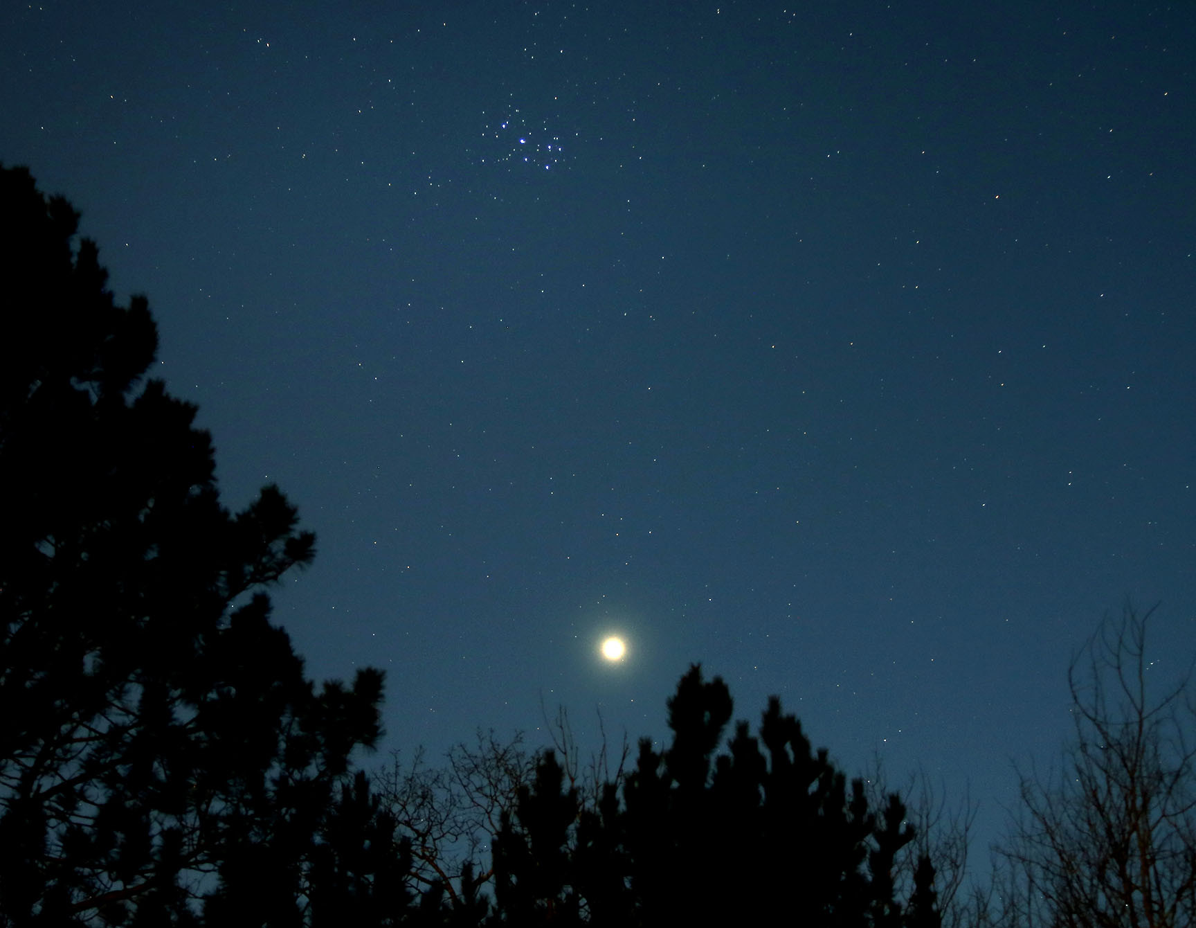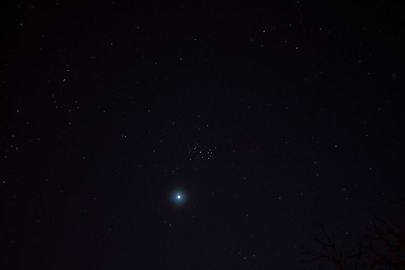 Комментарий к файлу: Сближение планеты Венера и скопления М45 "Плеяды". Фотоаппарат Canon 1100D, объектив 55мм, выдержка 15 секунд, диафрагма 5,6, ISO - 3200.